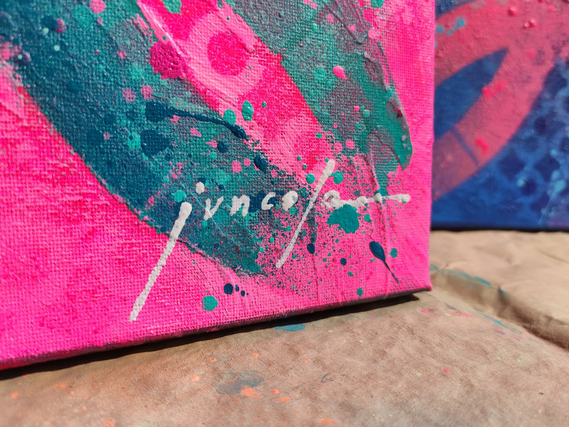 Tècnica mixta, amb base acrílica en roses i fúcsies en contrast amb els verds i turqueses del motiu principal.