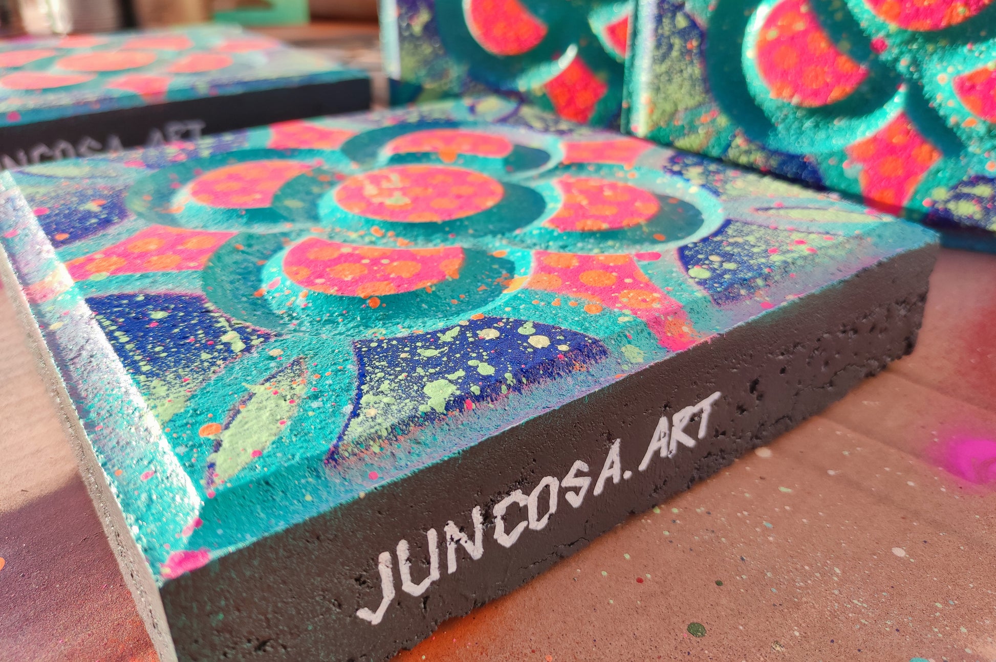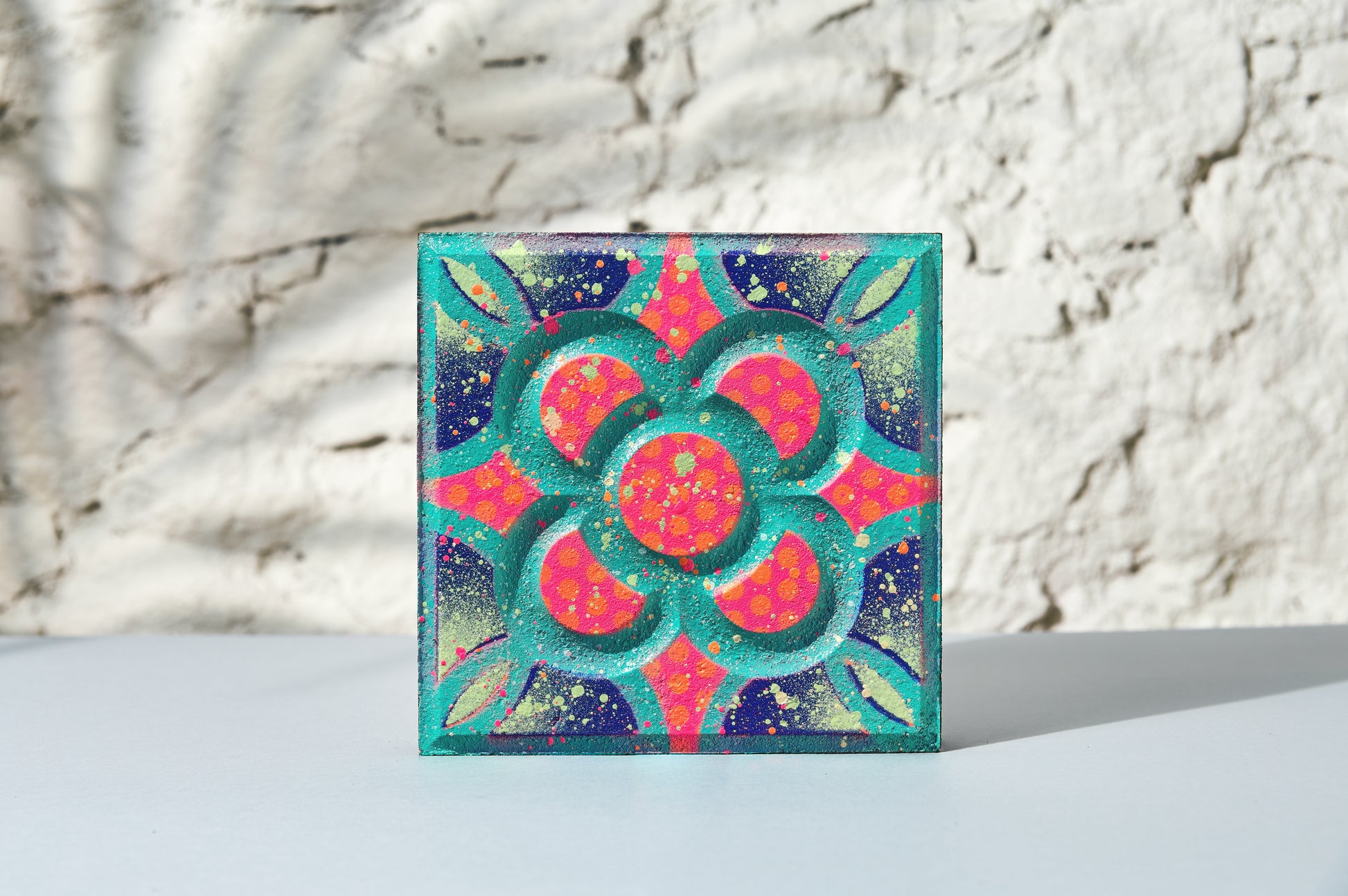 El color predominant és el turquesa, amb roses i taronges al centre i blau i verd clar als extrems.
