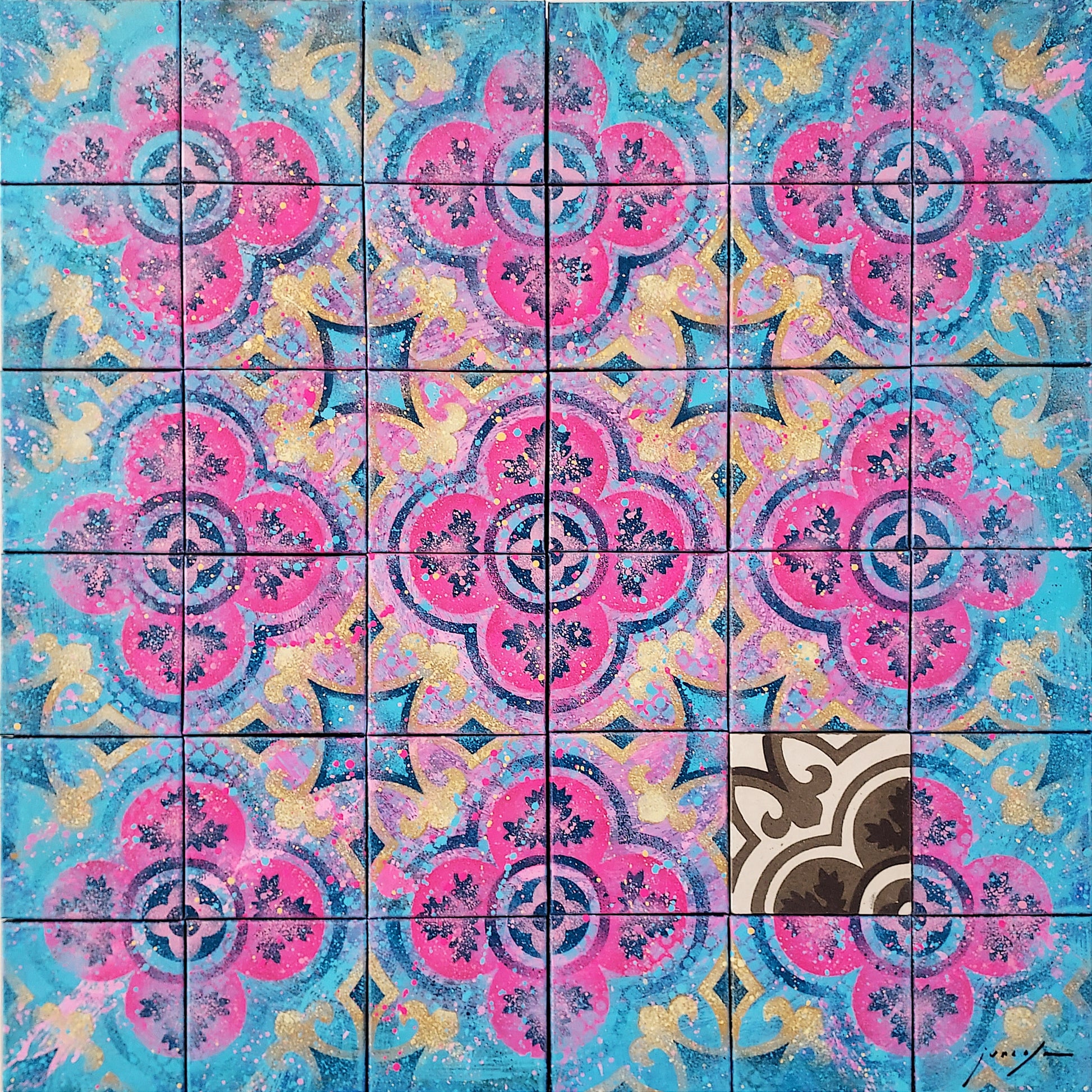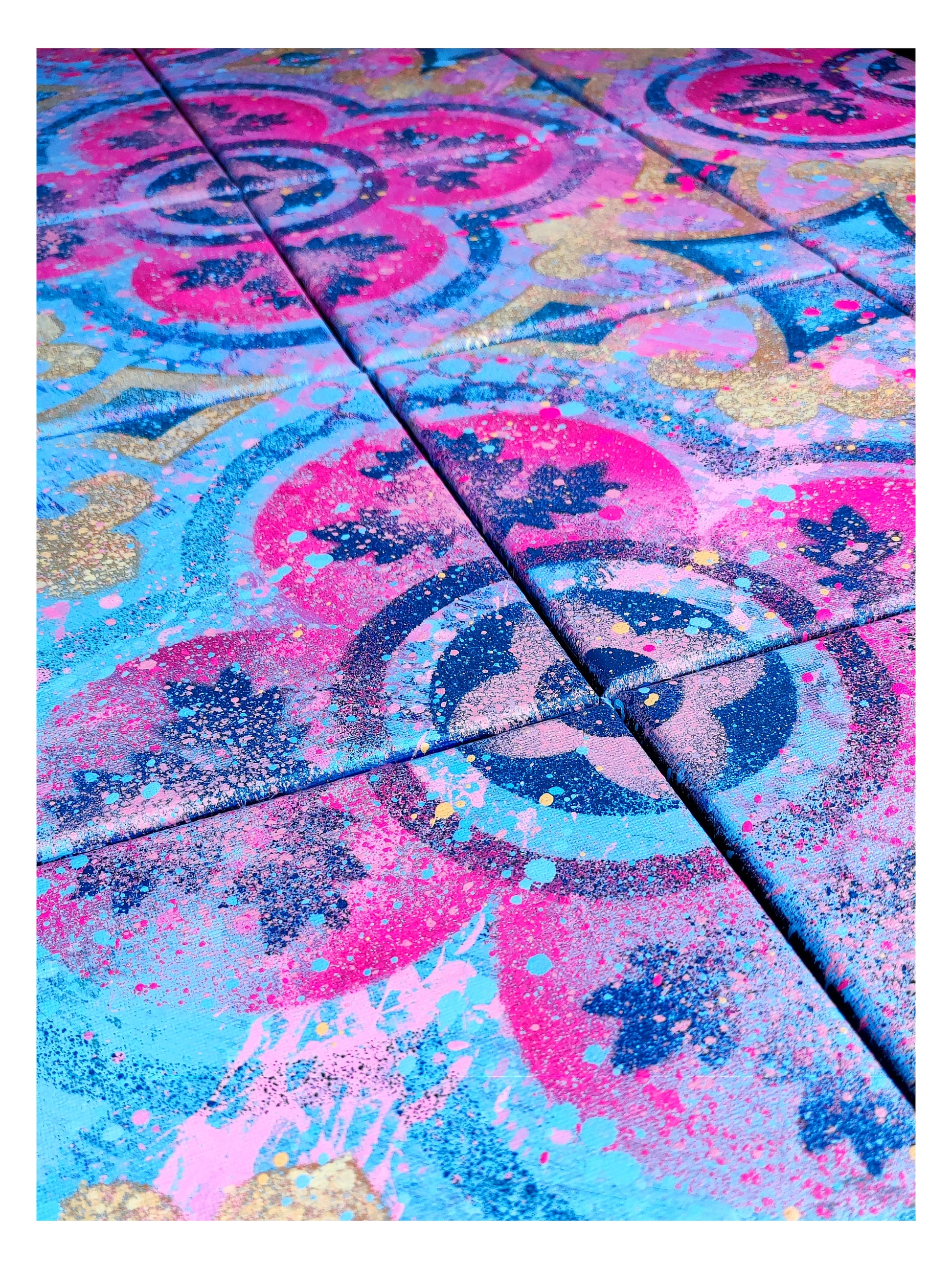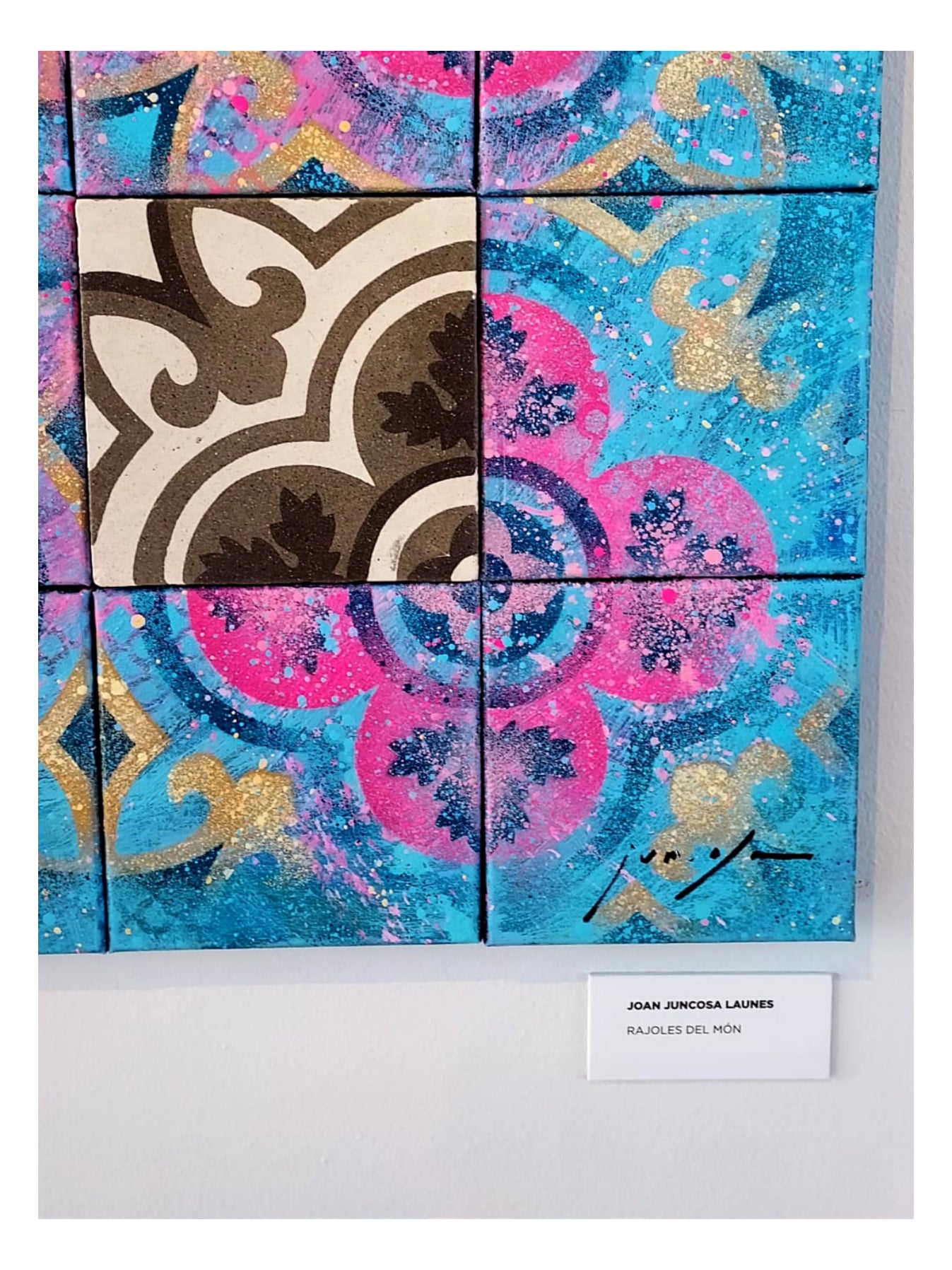 Con base de azules y amarillos, y una fusión de turquesas y fucsias se puede observar el uso de la textura, el degradado y las salpicaduras de color. Se trata de un conjunto de lienzos pintado por Juncosa, con su particular técnica de arte urbano, mezclando pintura acrílica, espray y salpicaduras