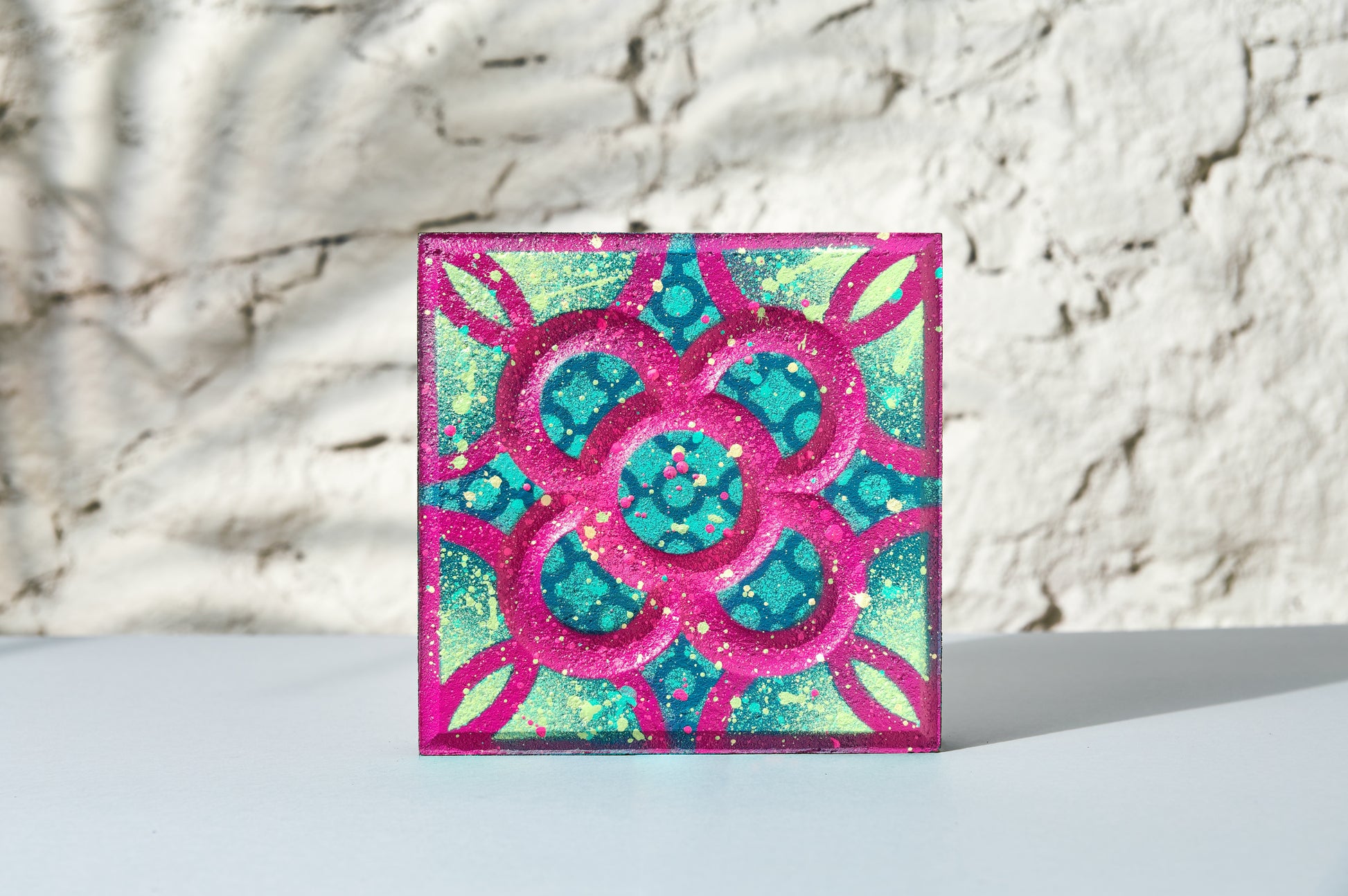 El color predominante es el lila, con verdes azulados en el centro y verde claro en los extremos.