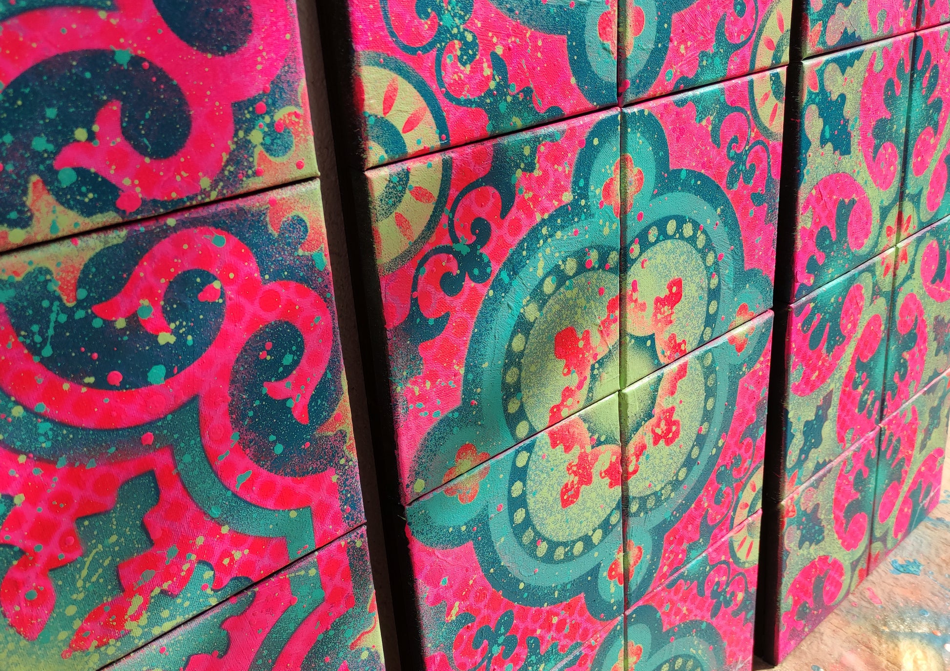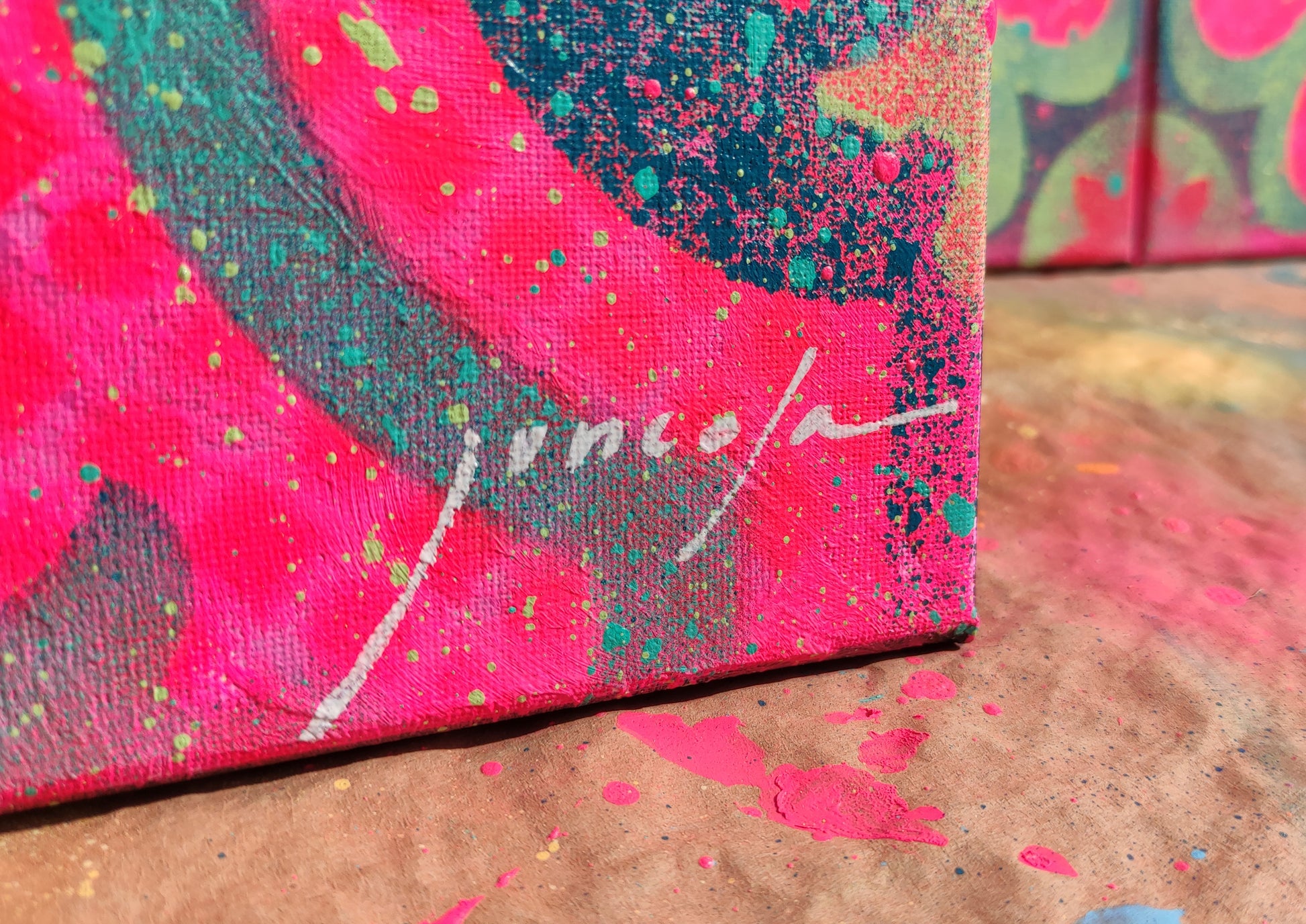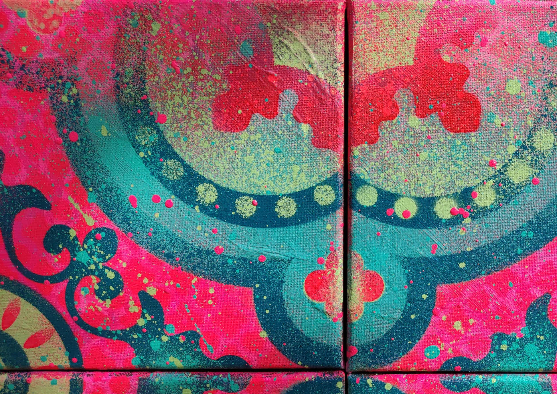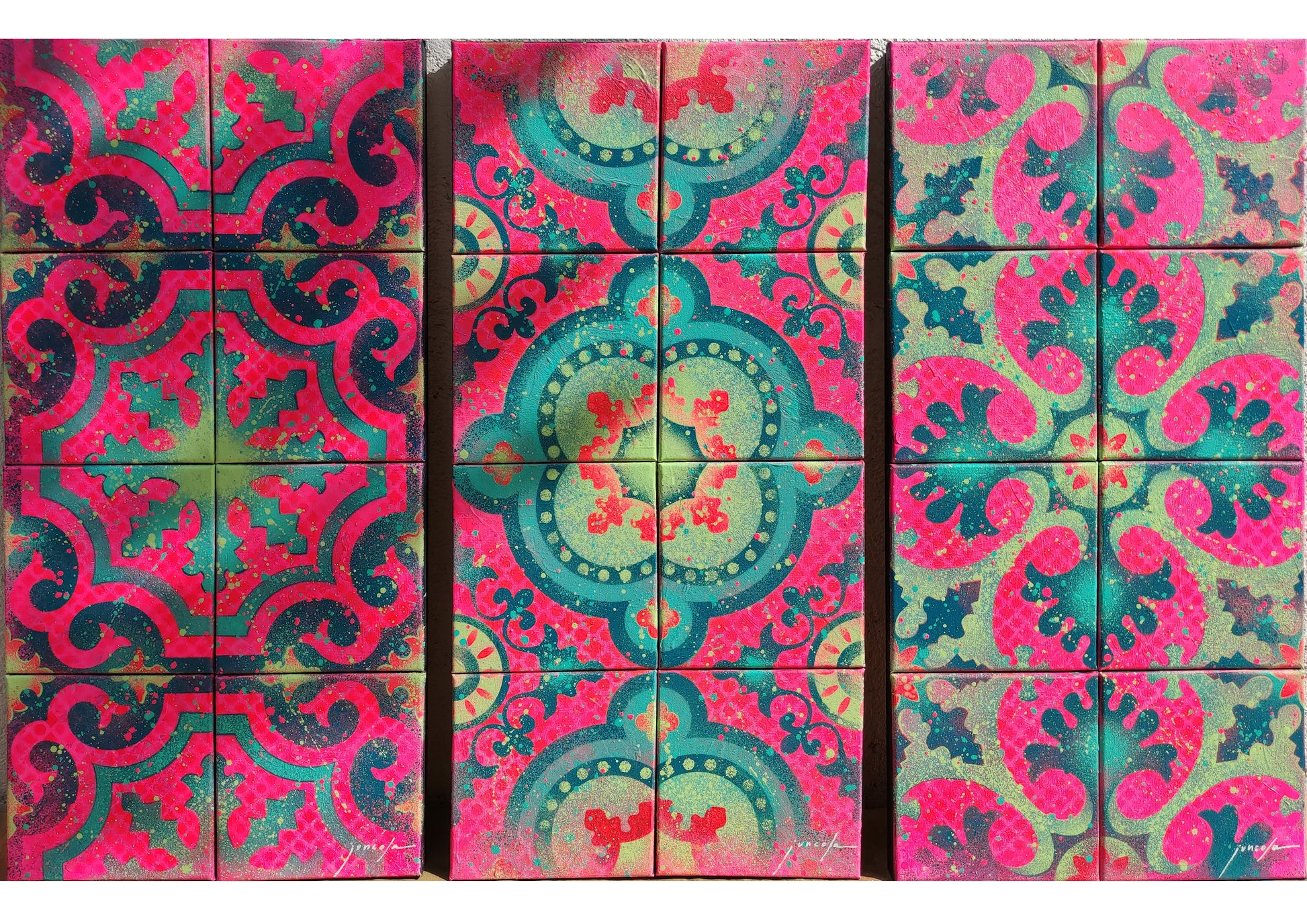 Tres obras que se miran entre sí, con distintos patrones pero un claro diálogo entre sus colores. El nexo de unión: el color del fondo, rosa fucsia, que permite una explosión de colores, destacando turquesas, verdes y amarillos.