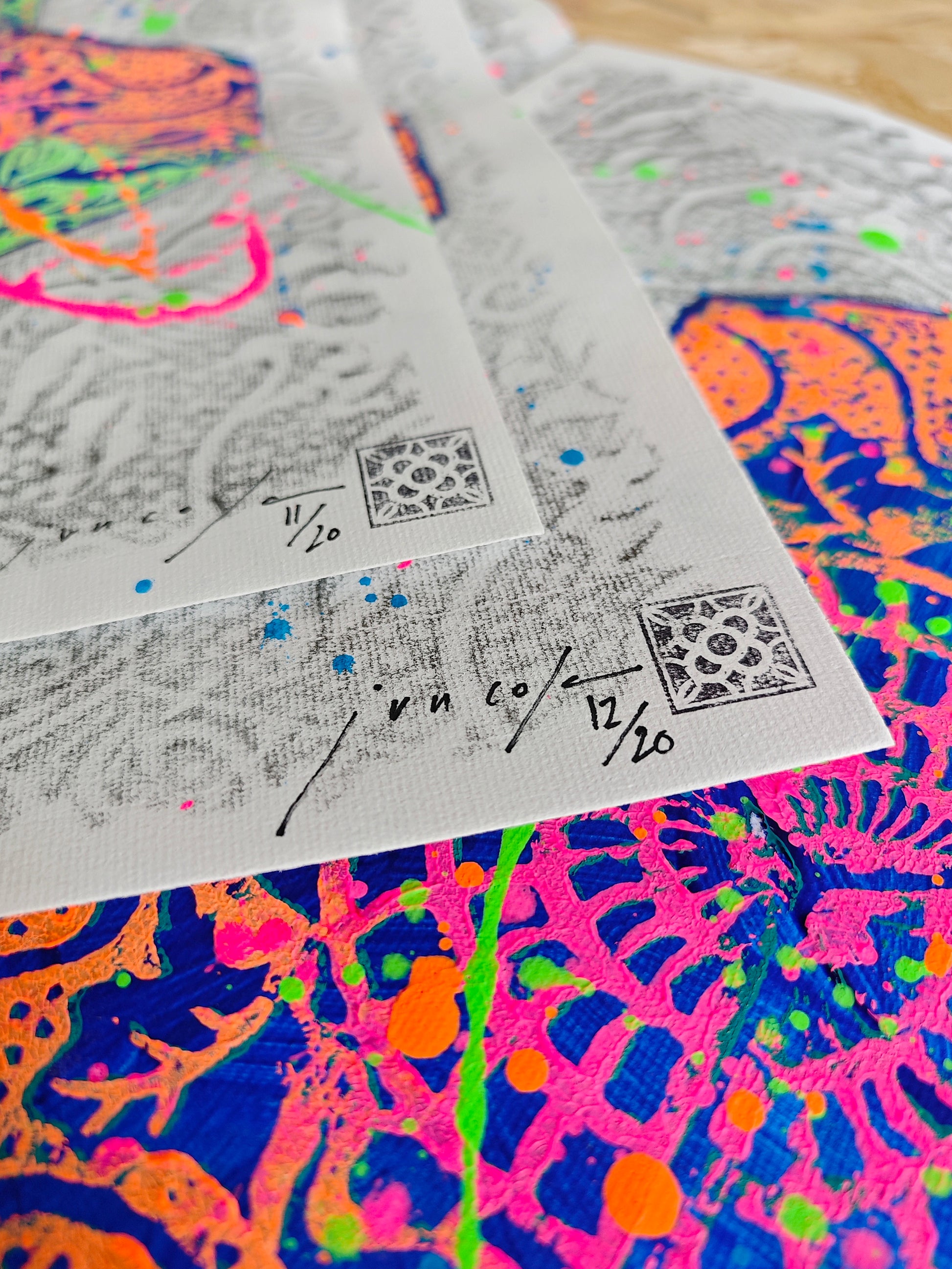 Se trata de una lámina pintada por Juncosa, con su particular técnica de arte urbano, mezclando pintura acrílica, grafito y salpicaduras.
