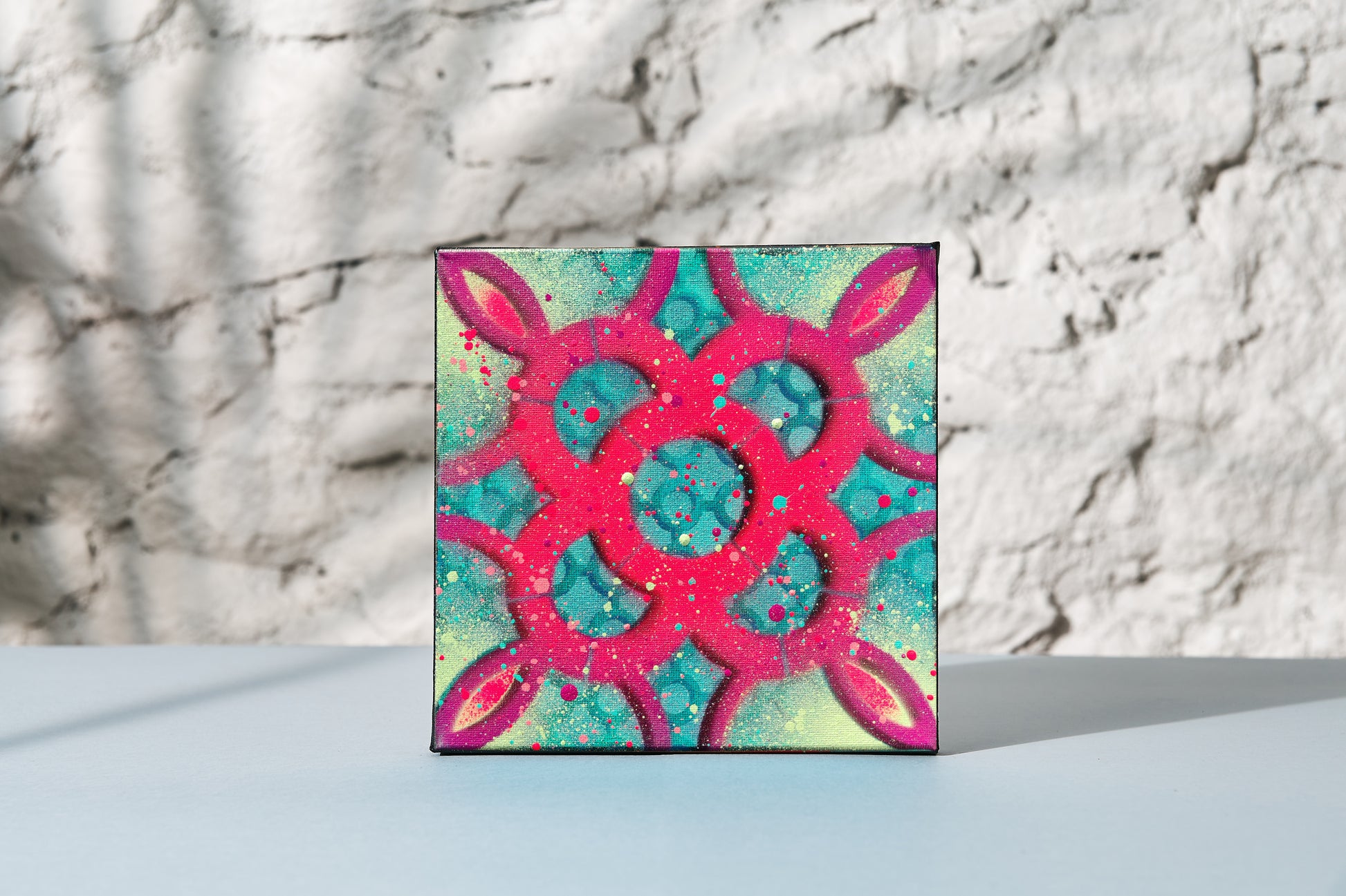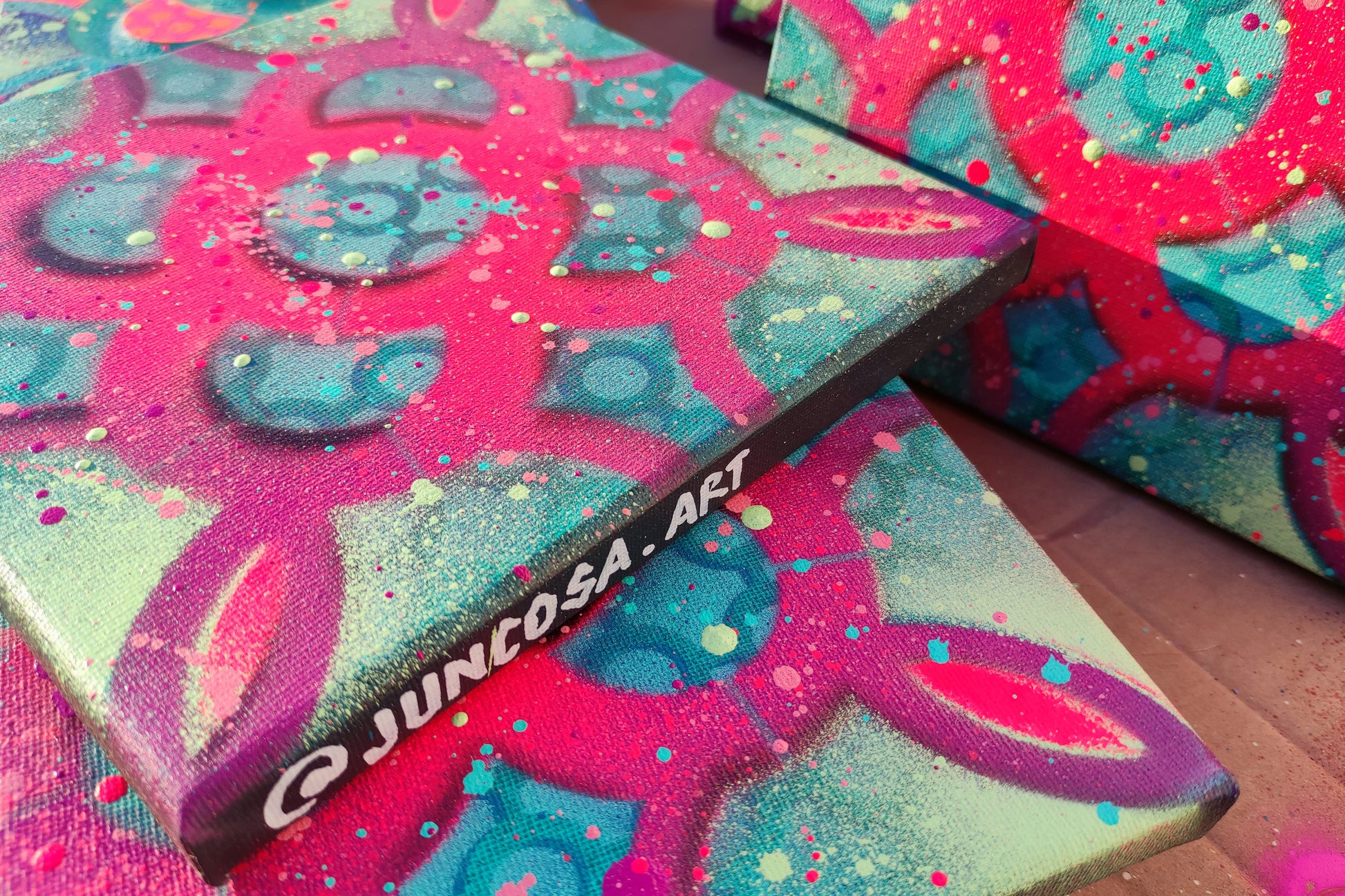 Pieza de la colección Flor, inspirada en el suelo de Barcelona. Se trata de un lienzo pintado por Juncosa, con su particular técnica de arte urbano, mezclando pintura acrílica, espray y salpicaduras. En ella se puede apreciar el efecto relieve en el dibujo de la flor del Panot.