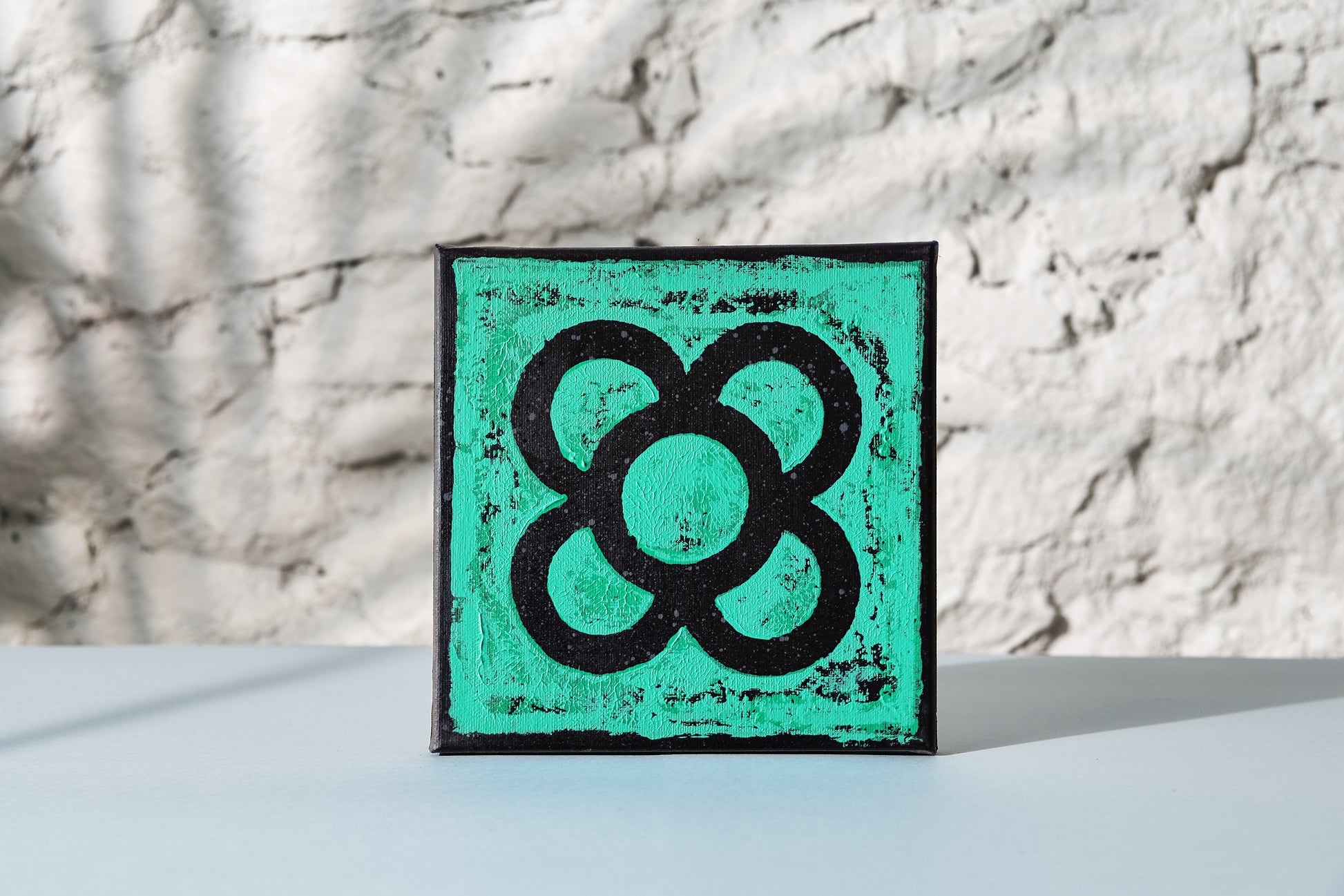Pieza de la colección Origen, inspirada en el suelo de Barcelona. Se trata de un lienzo pintado por Juncosa, con su particular técnica de arte urbano, que mezcla espray, pintura acrílica y salpicaduras. En ella se puede apreciar la flor del panot, símbolo de la ciudad.