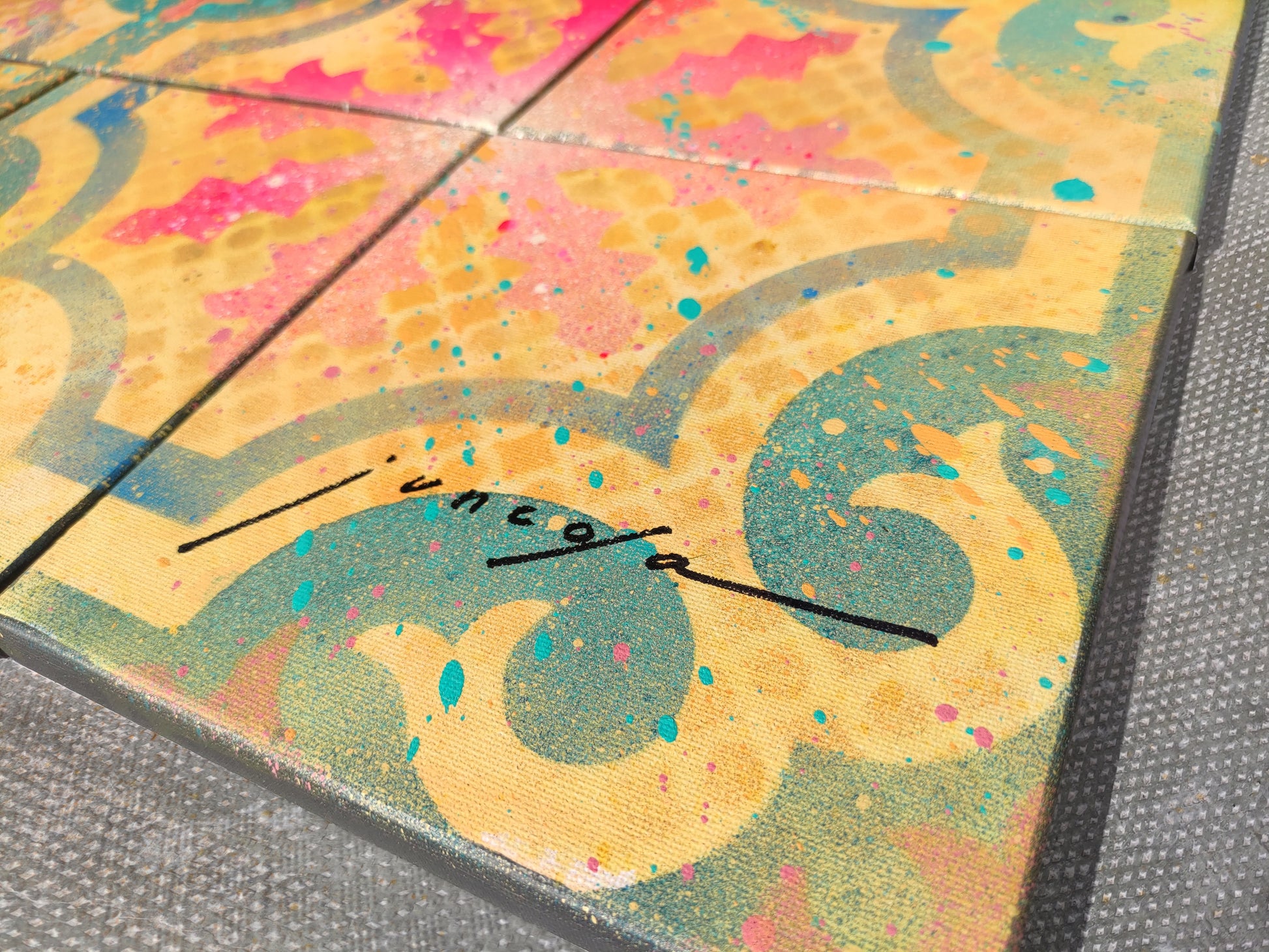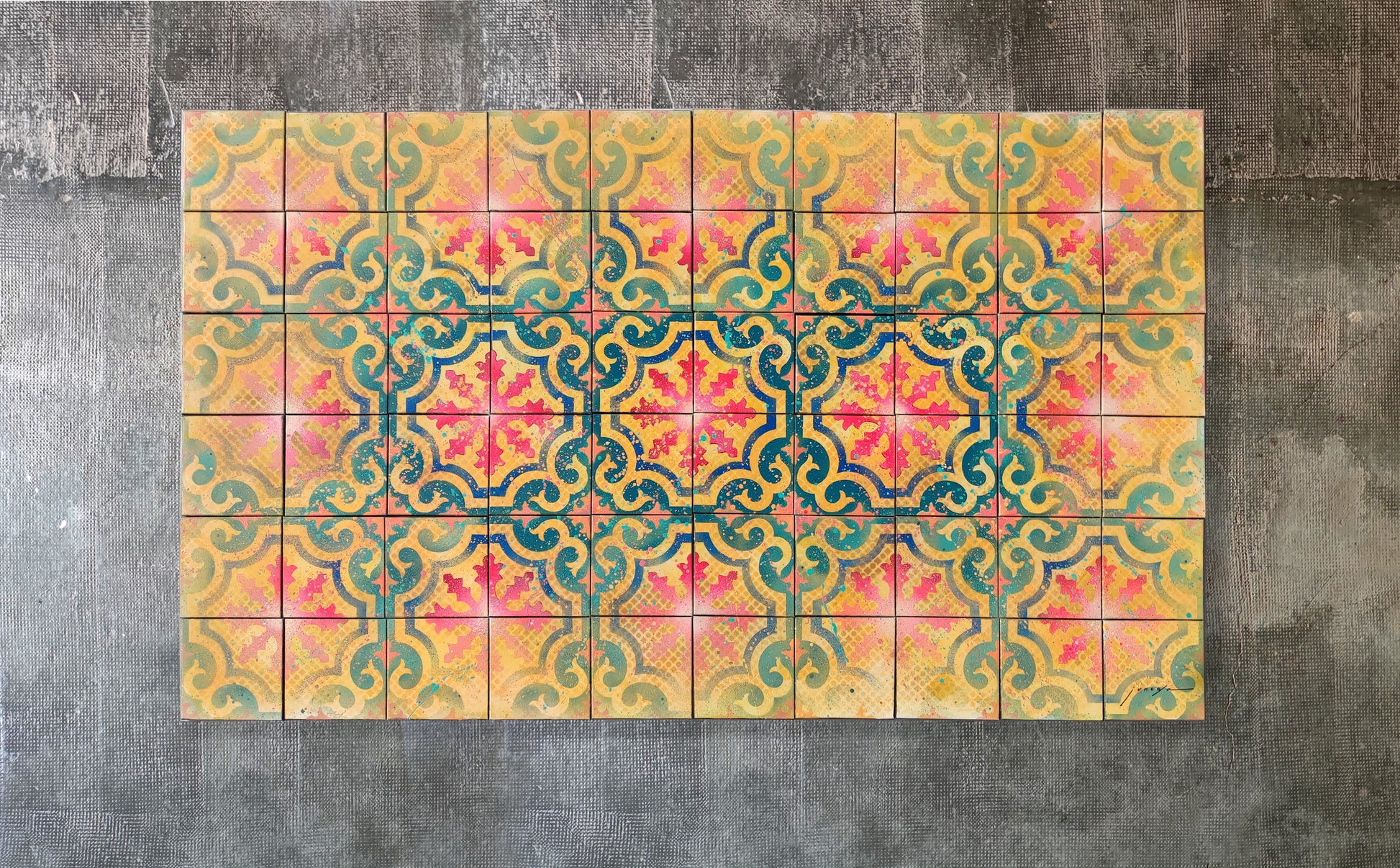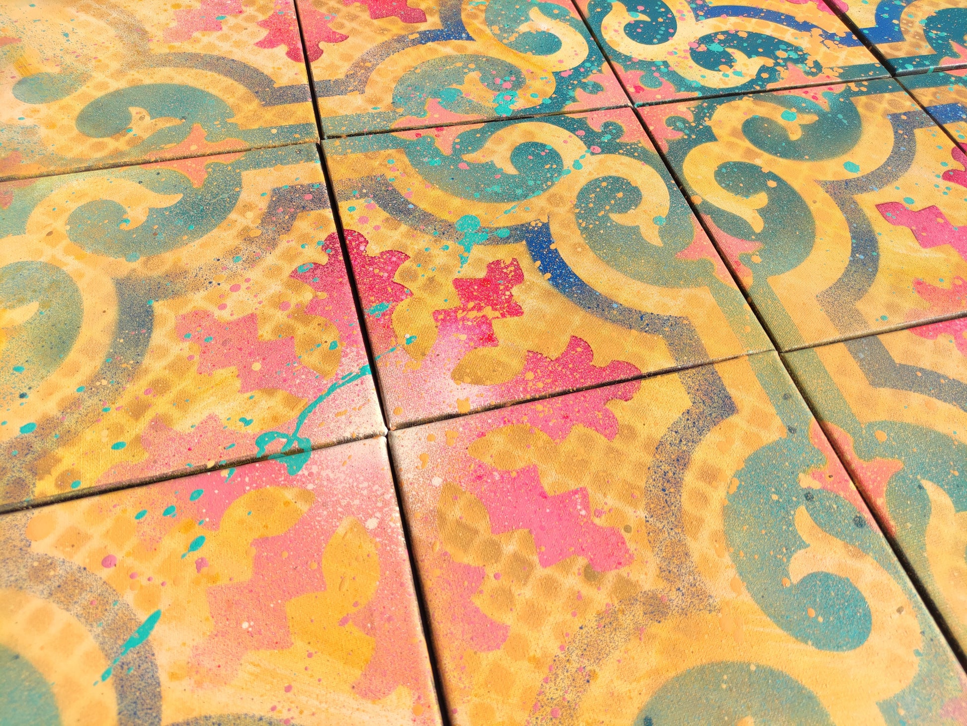 Con base de ocres y amarillos, y una fusión de turquesas y fucsias se puede observar el uso de la textura, el degradado y las salpicaduras de color.