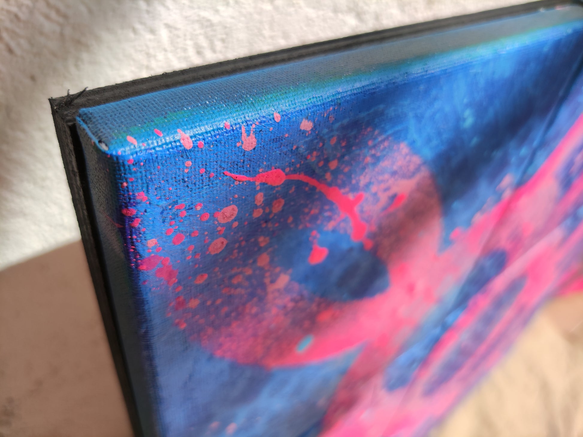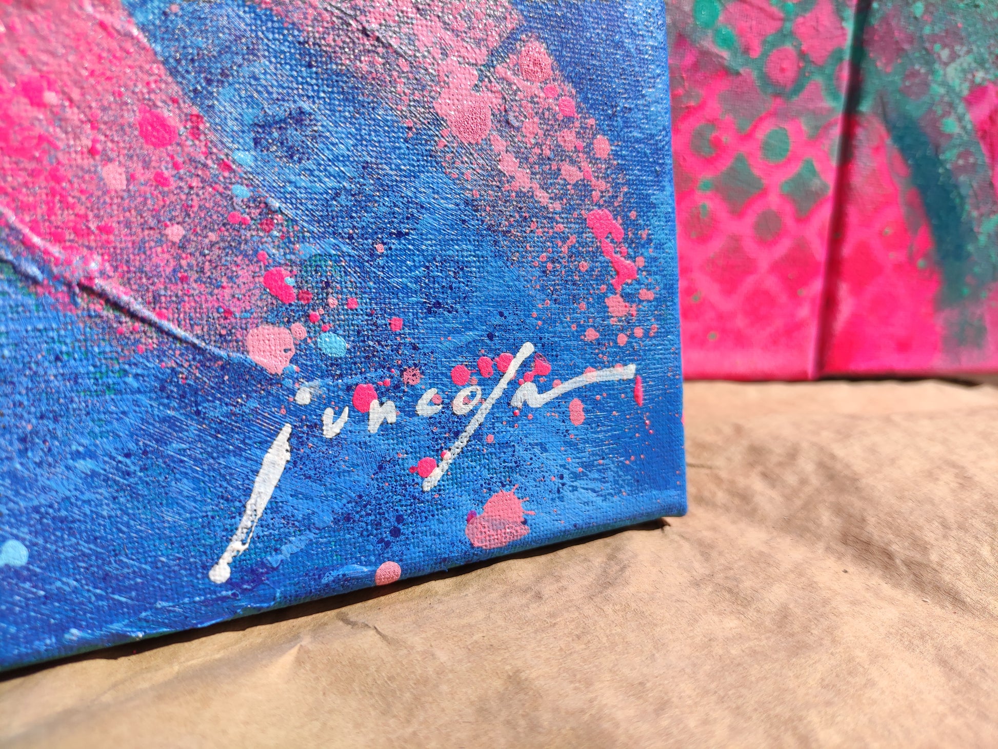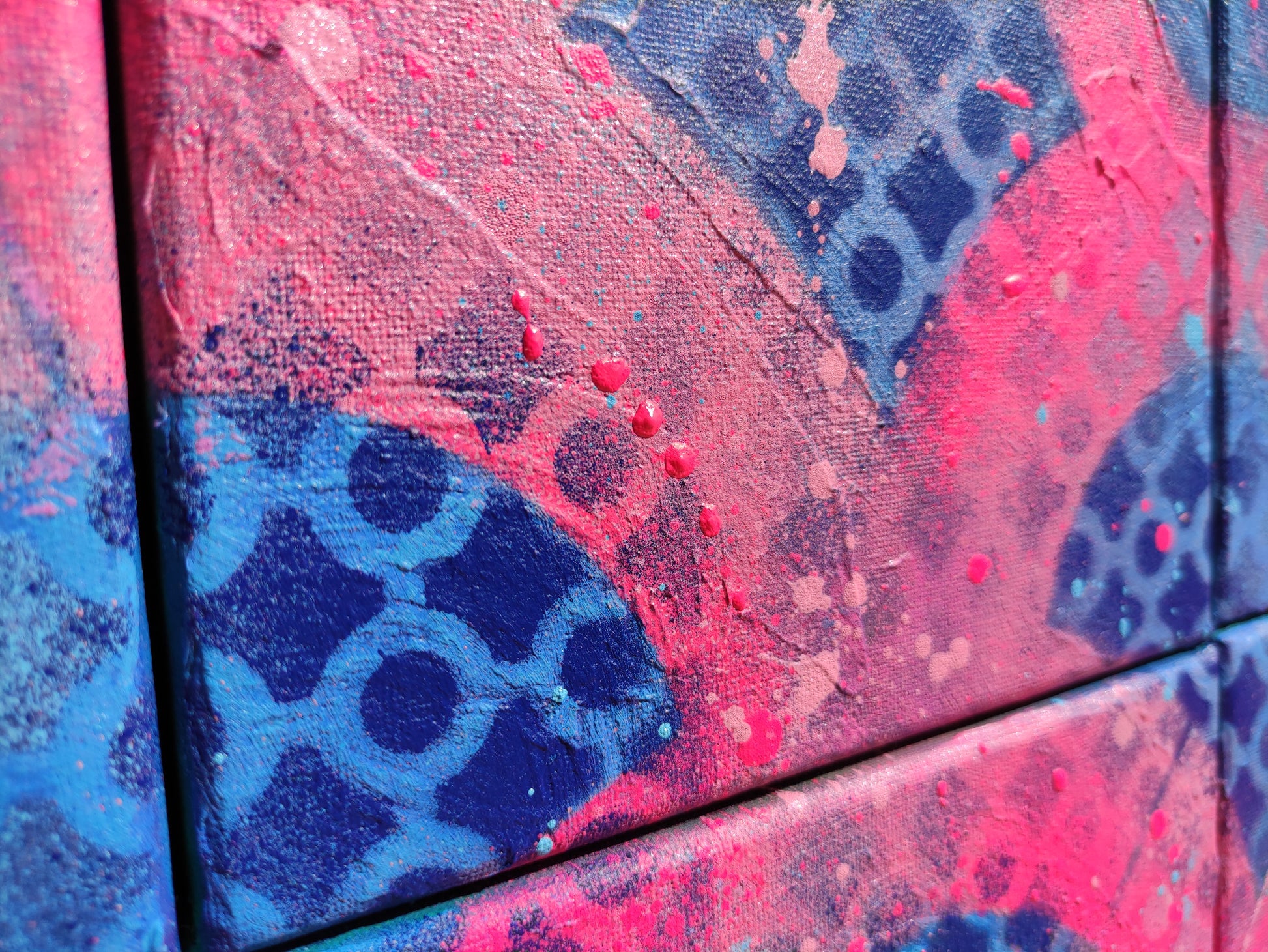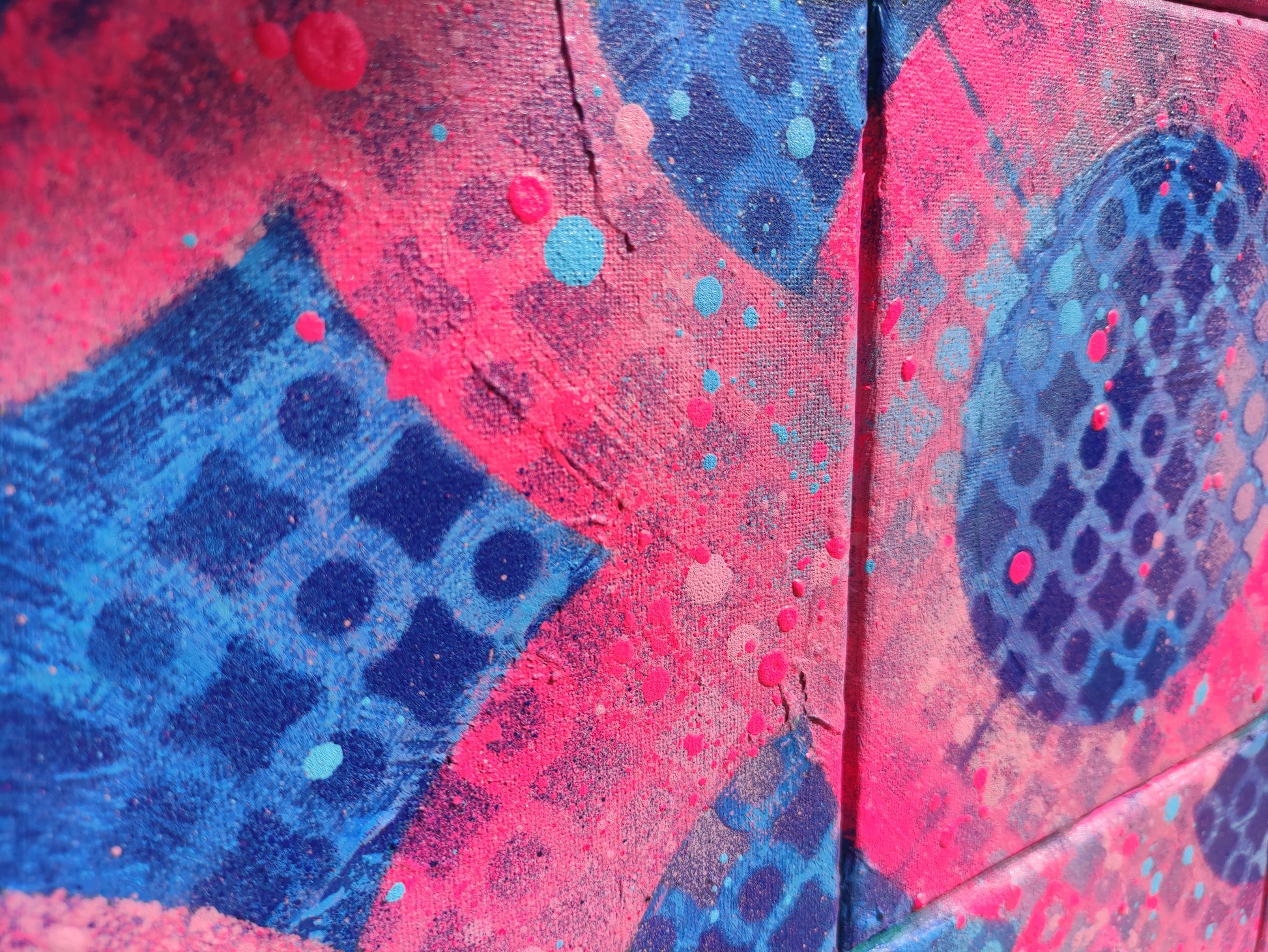 Técnica mixta, con base acrílica en colores azulesen contraste con los rosas y fucsias del motivo principal.