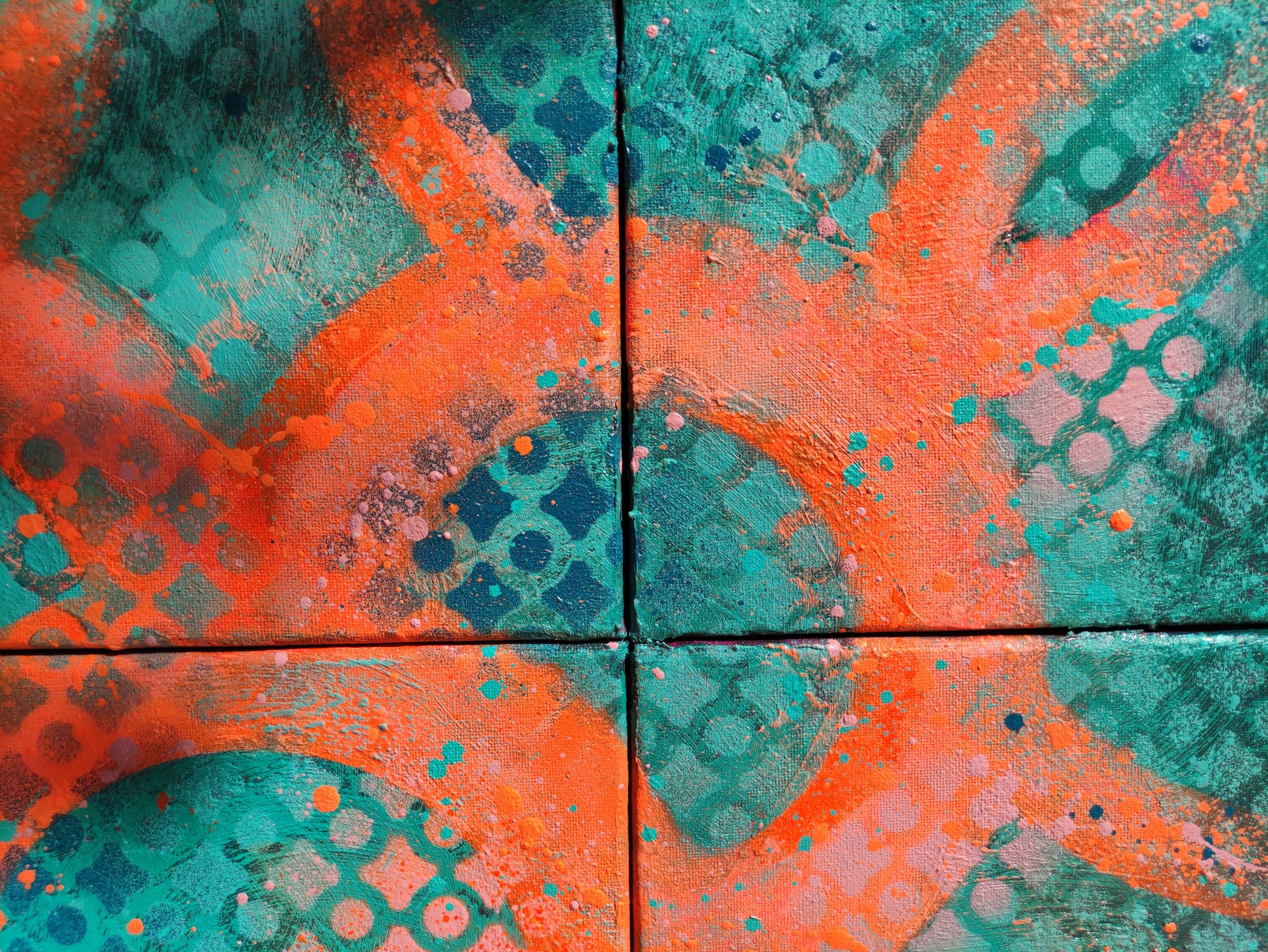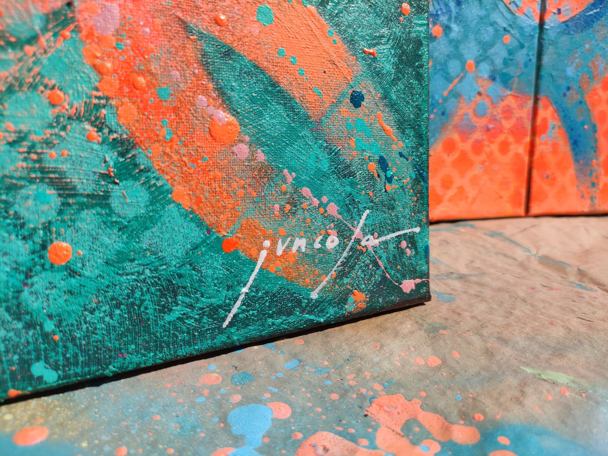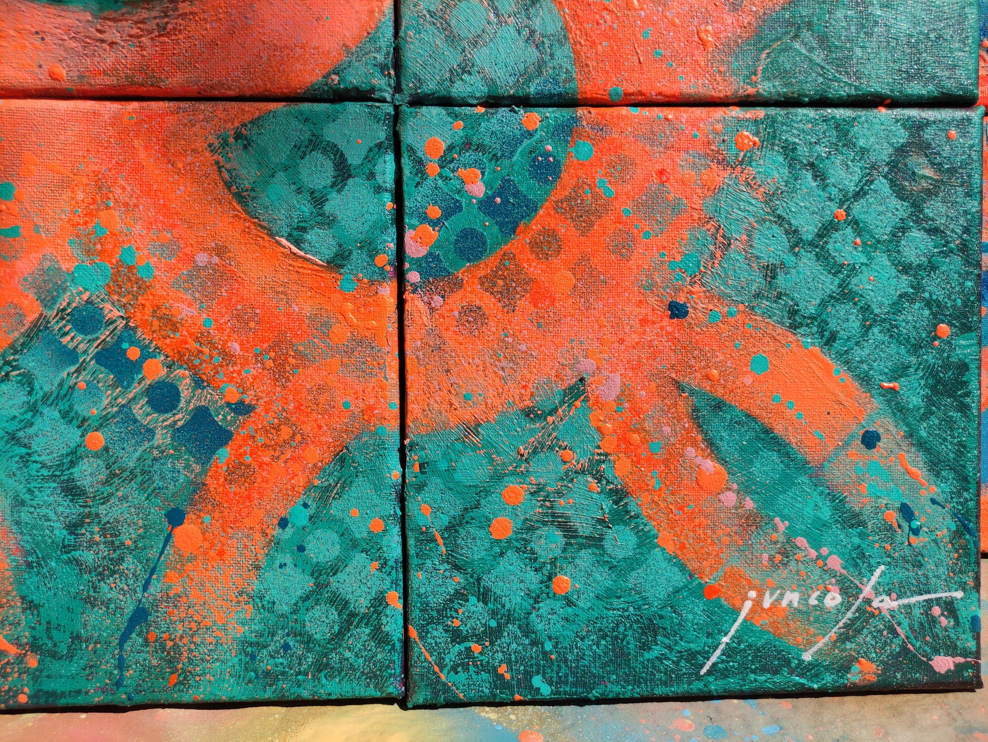 Técnica mixta, con base acrílica en colores verdes contraste con los naranjas del motivo principal.