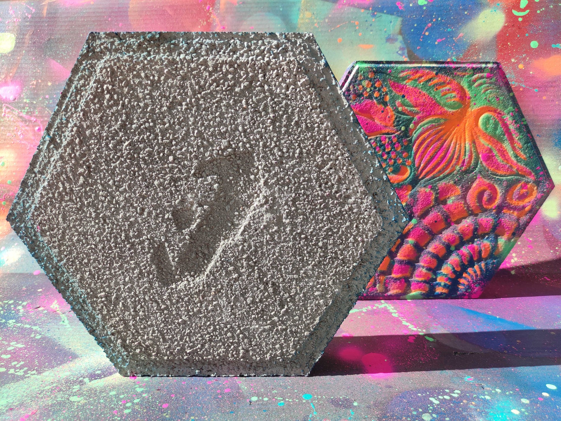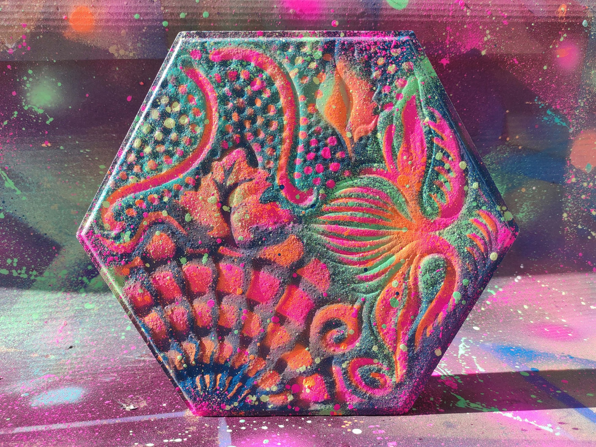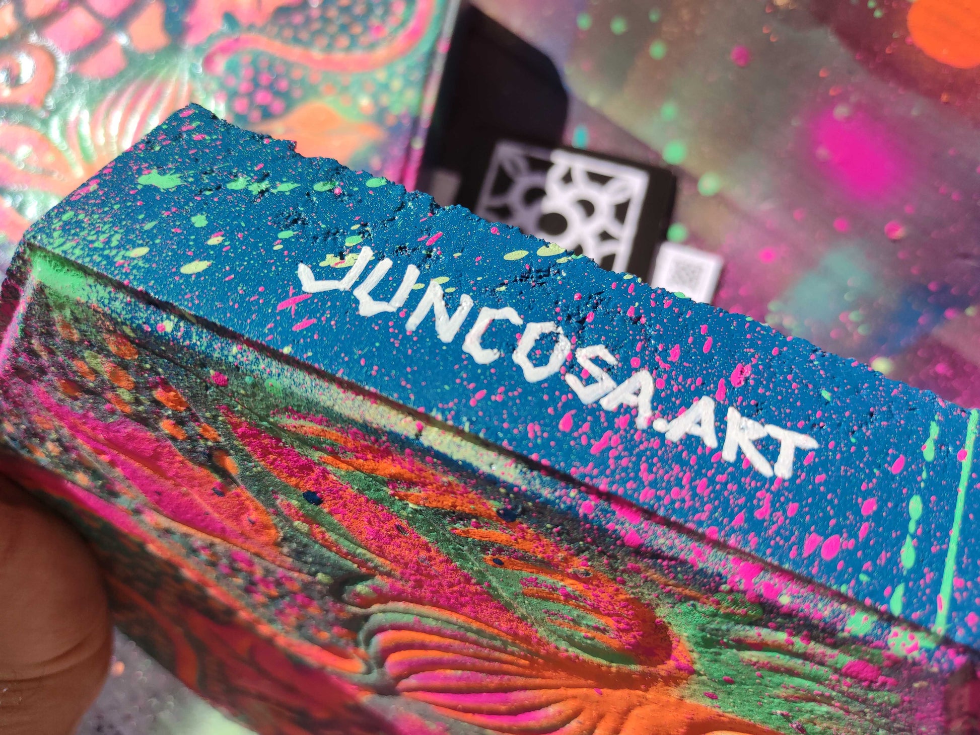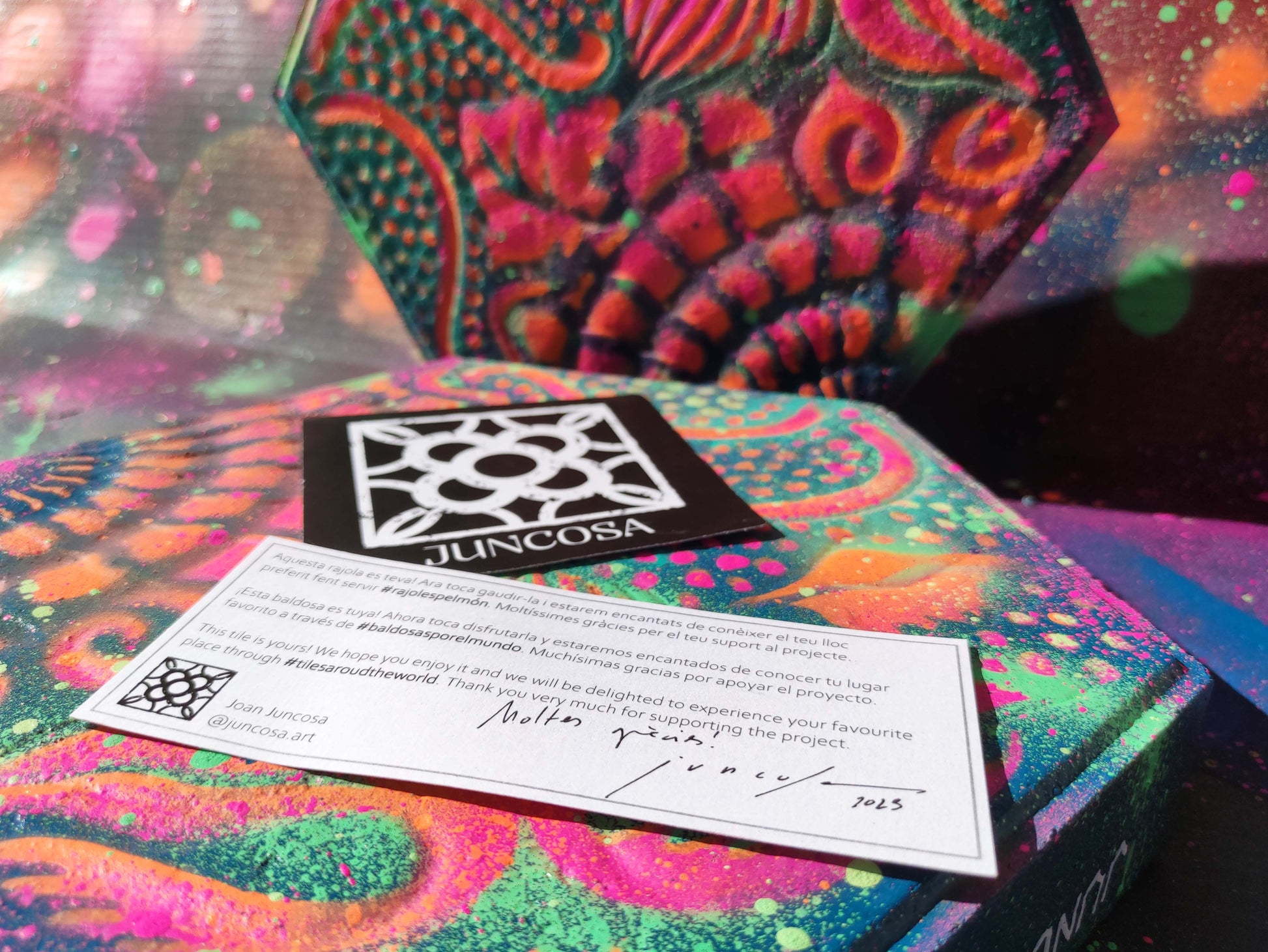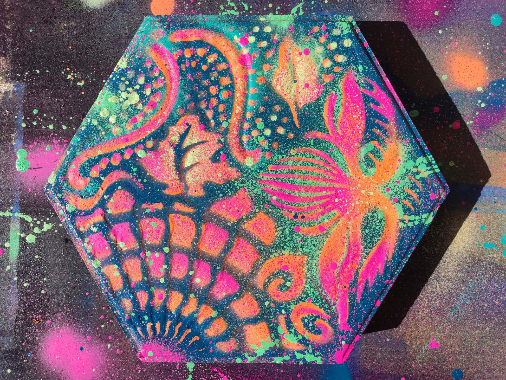 Con el turquesa como color de fondo, los colores flúor acompañan al relieve de esta pieza, evocando el fondo marino.