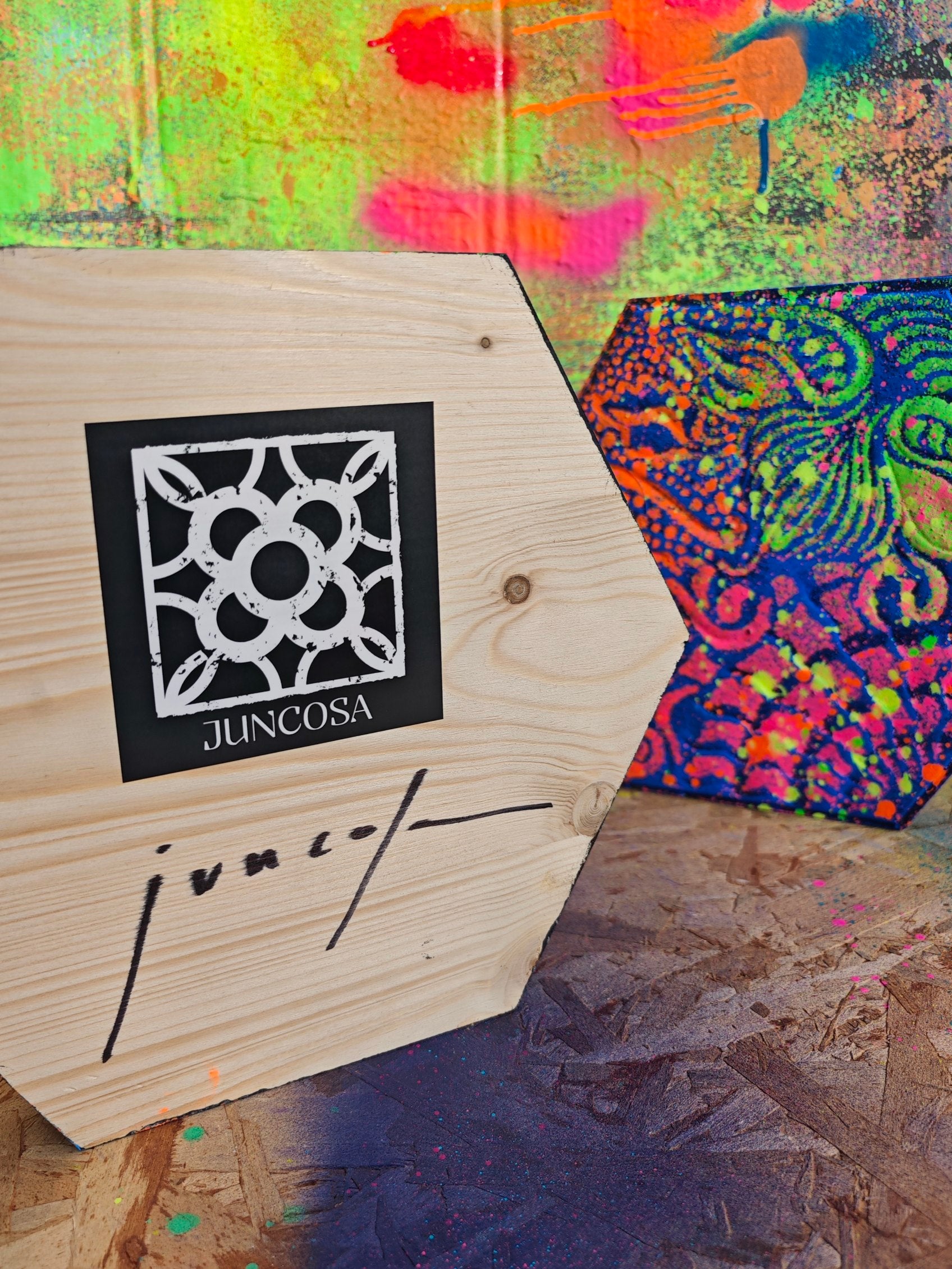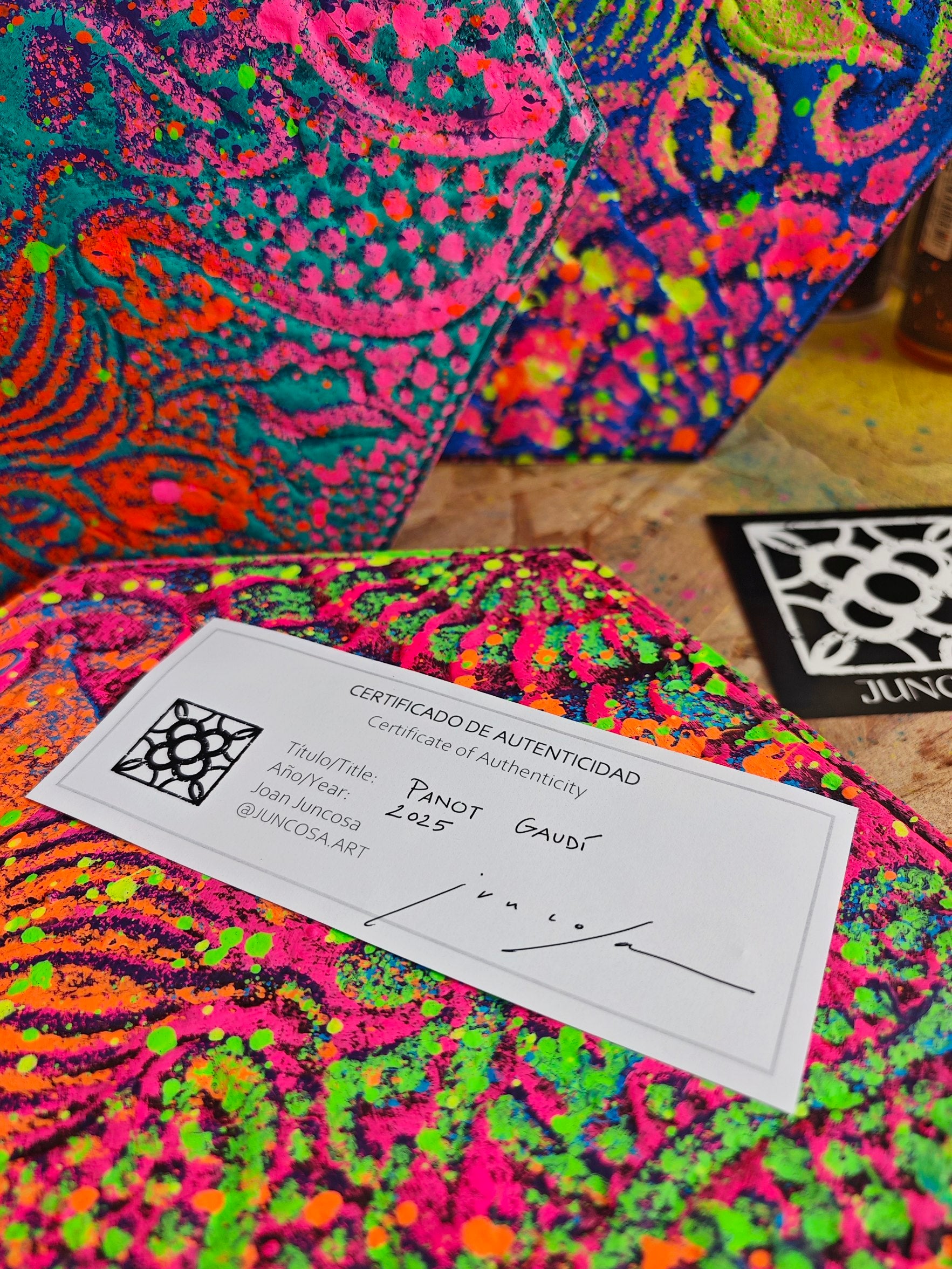 Obra inspirada en el emblemático panot modernista diseñado por Gaudí y reinterpretada con color por el artista Juncosa. Cada pieza está realizada en madera tallada, incorporando en relieve el dibujo original del panot que caracteriza al Passeig de Gràcia.