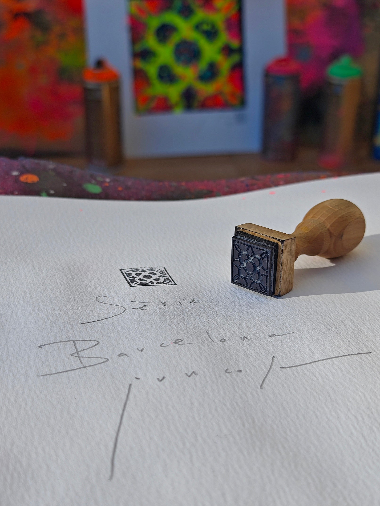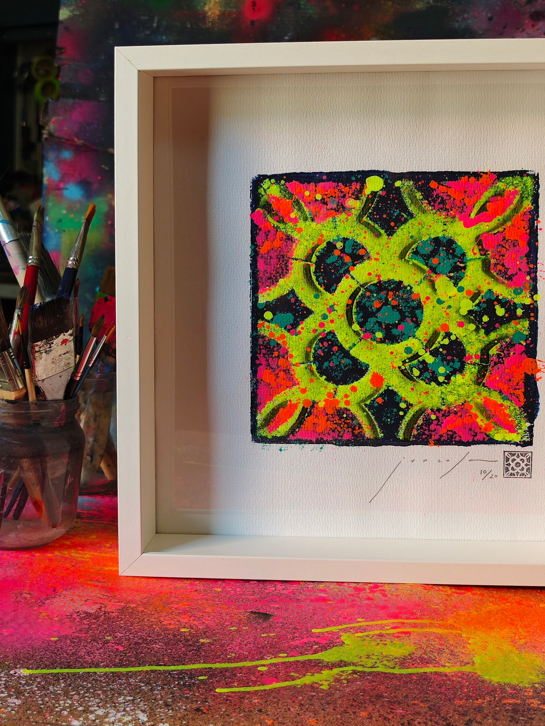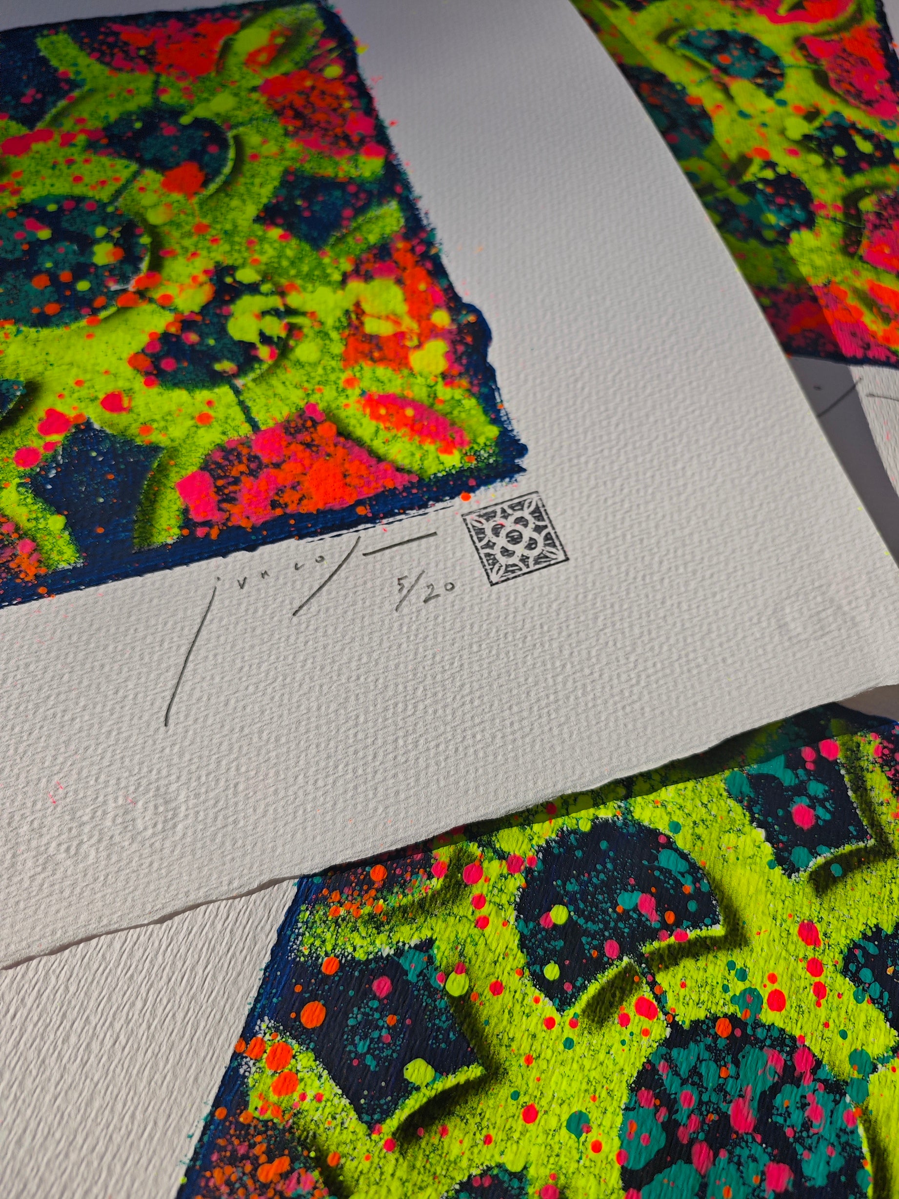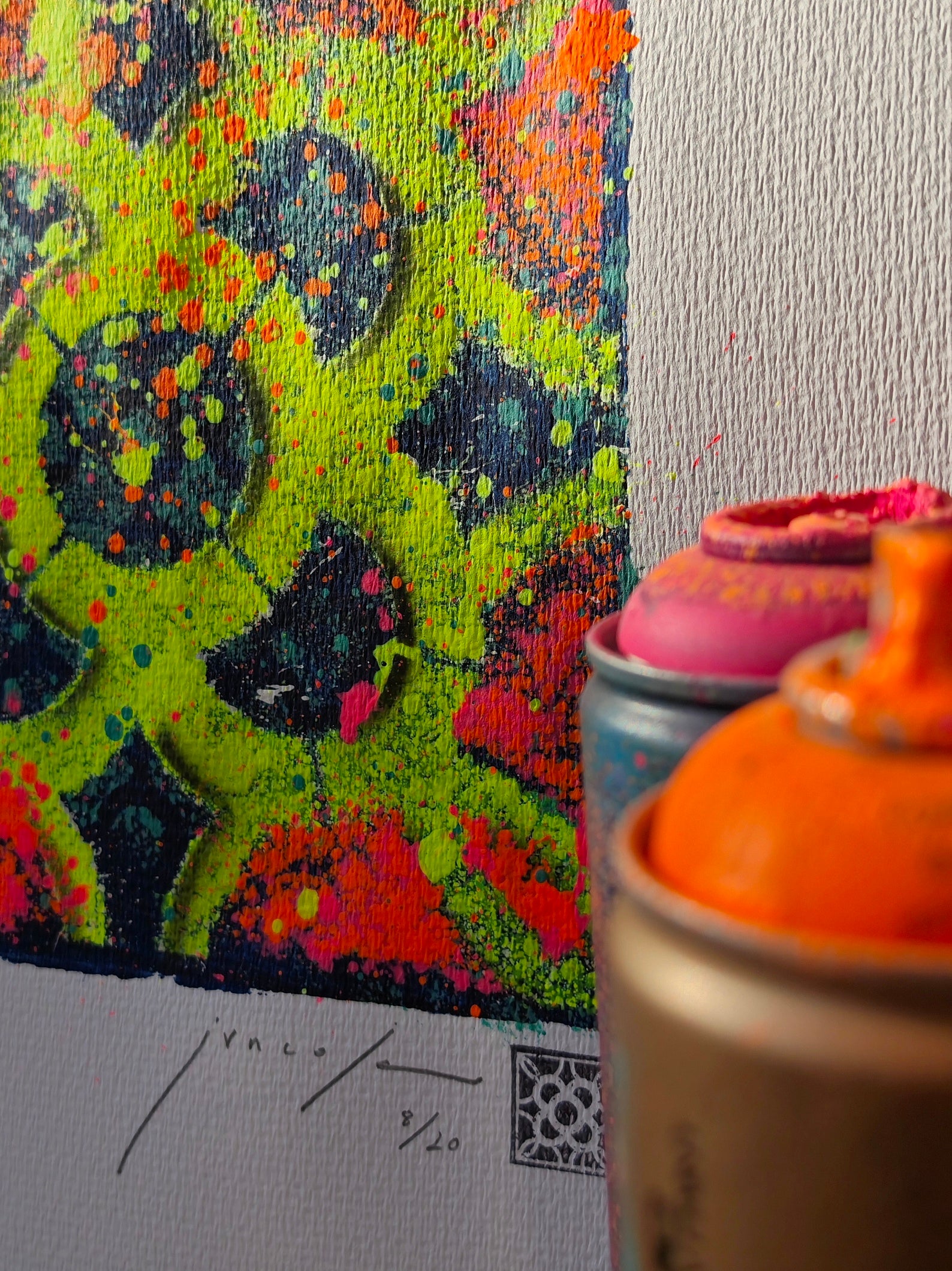Lámina Original de la Serie Barcelona, inspirada en los patrones de las aceras de Barcelona, con la flor del panot como protagonista. Se trata de una lámina de papel pintada por Juncosa, con su particular técnica de arte urbano, mezclando pintura acrílica, espray y salpicaduras.