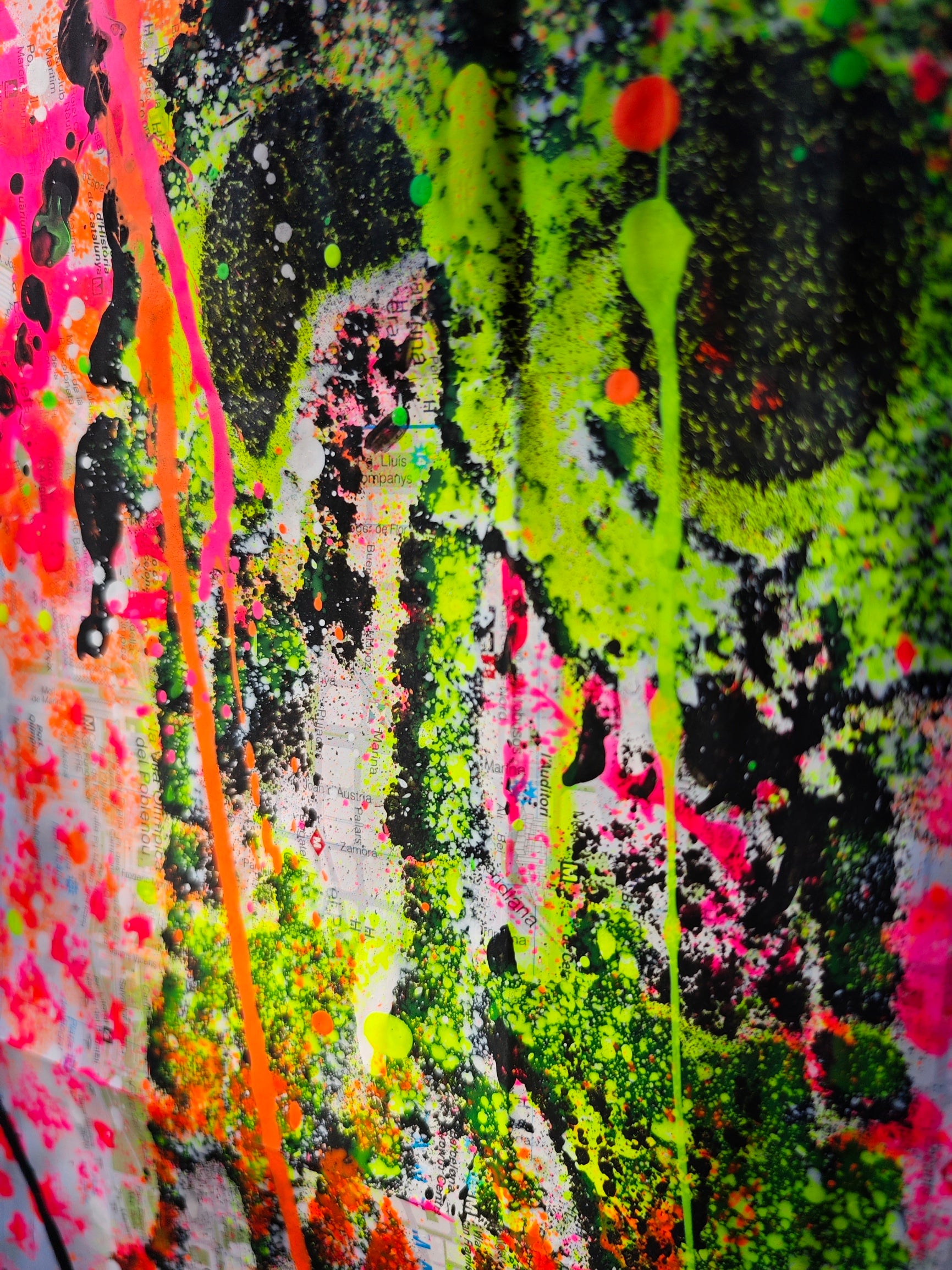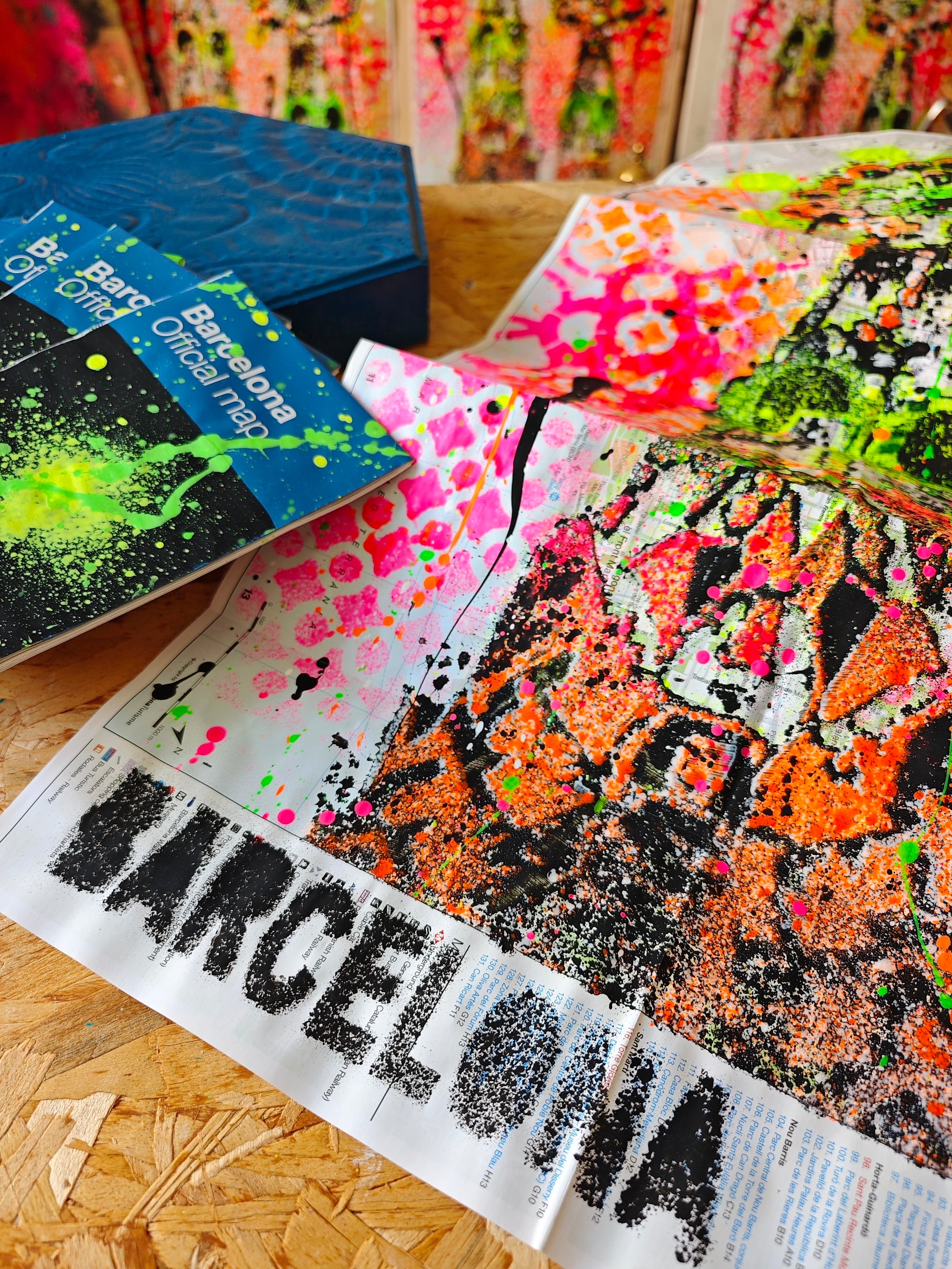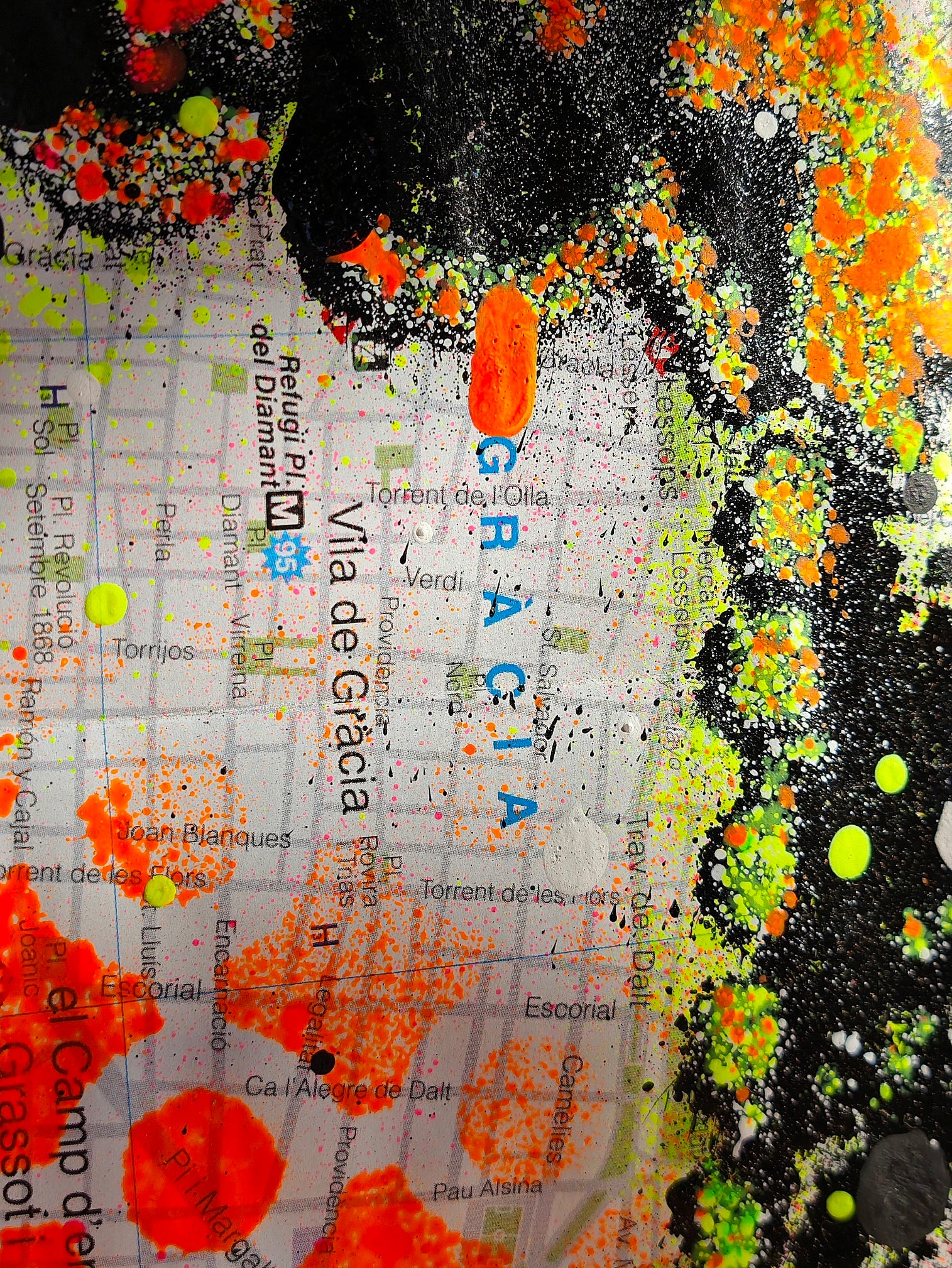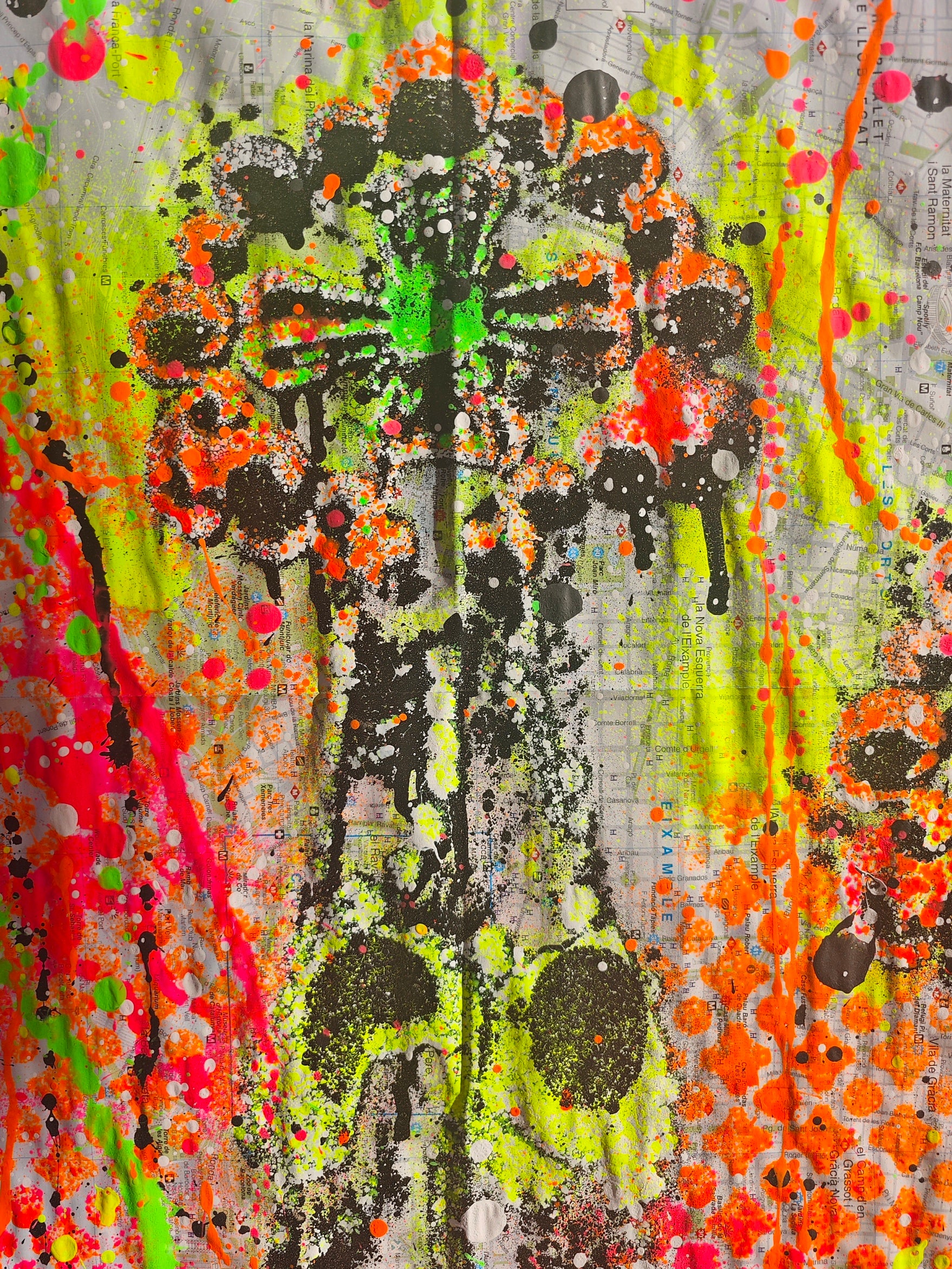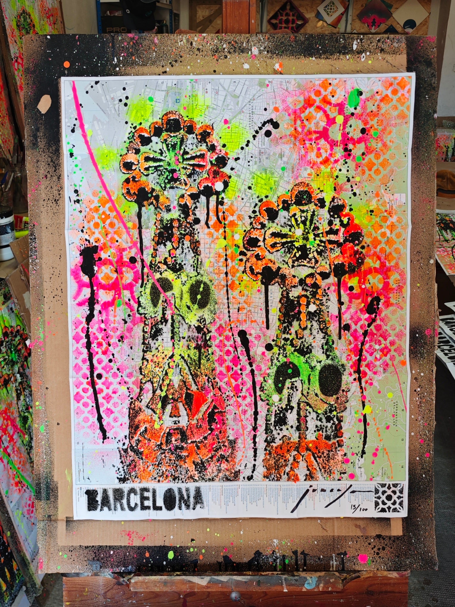 Obra pintada por Juncosa, con su particular técnica de arte urbano, mezclando pintura acrílica, espray y salpicaduras. En primer plano se presenta en detalle de las Torres de la Fachada de la Pasión del Templo Expiatorio de la Sagrada Familia, y de fondo se pueden observar los detalles del urbanismo de la ciudad, los nombres de sus calles, plazas y lugares emblemáticos.
